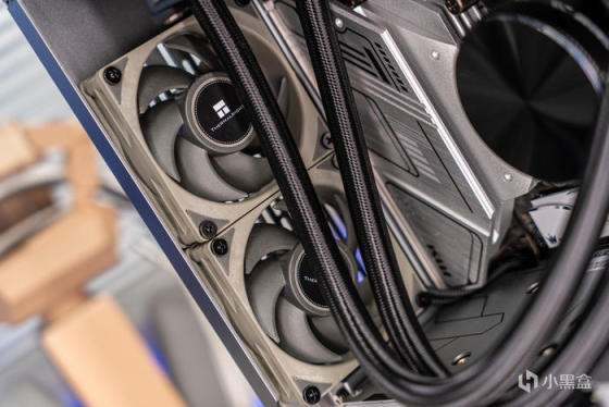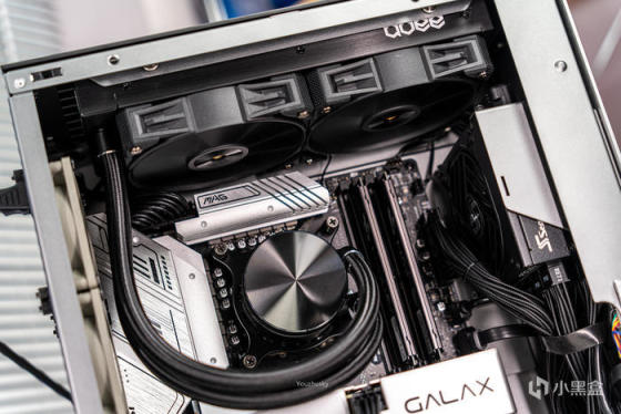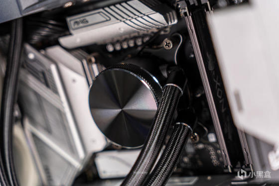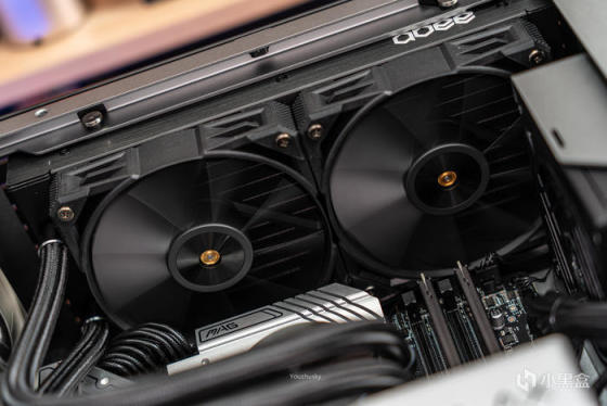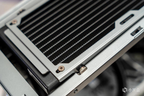 可拆卸240冷排架上的abee APEX PLUS i240水冷,开窗式方形冷排鳍片非常工整,关键是水道与鳍片接触面积增加300%使得热量加速传递,240规格下400W TDP的大设定