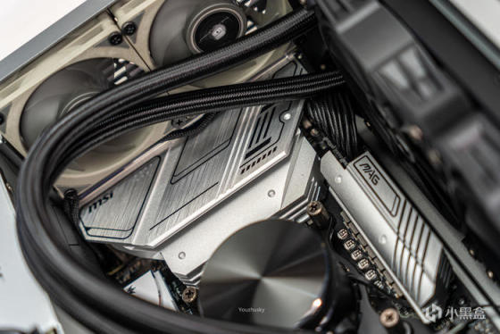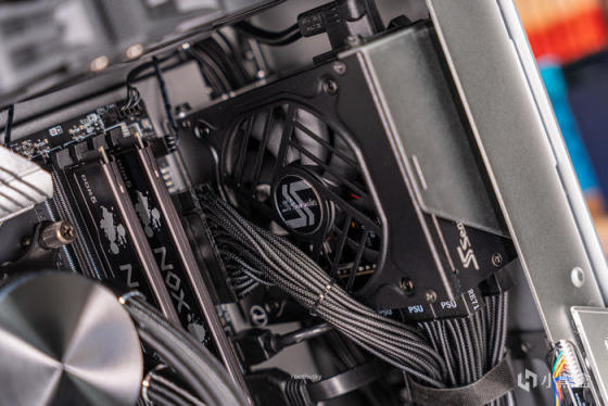这次的装机配置上使用了微星MAG B760M MORTAR WIFI 迫击炮主板,它采用微星第三代钛金电感和12相75A规格的供电,配合双8P的CPU供电接口应付即将到来的14900K也是没有问题的,而此次搭建的无光小主机使用了13700KF,散热采用的是abee APEX PLUS i240无光铝合金水冷,240冷排下可达到400W TDP。使用的显卡是来自影驰的4060金属大师OC,银色铝合金机箱搭配银色的金属大师,浑然一体。使用的内存也是无光的,来自宇瞻的NOX 暗黑马甲 DDR5 6400套装。固态硬盘是使用8通道群联PS5018-E18主控的影驰HOF EXTREME 1TB。电源为SFX规格小钢炮来自海韵的全日系电容、第4代数字IC温控技术、新一代制程工艺和10年质保的SGX-750。最后为了照顾整体散热均衡,底部加装3把利民TL-B8进风,尾部加装2把利民TL-B8出风,并都限速1000转静音的目的。