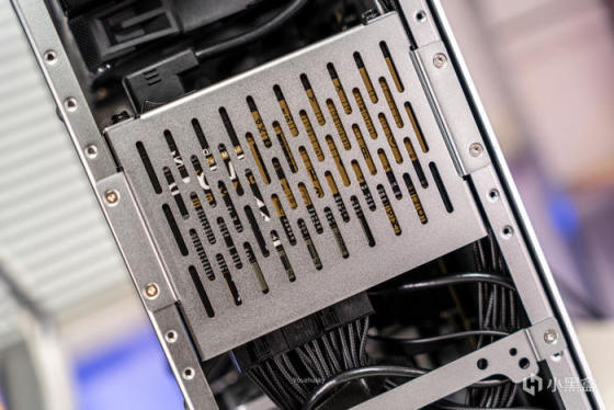 拆下前面板,中间的电源安装支架可以有上下四个限高安装档位,可在风冷、水冷的限制下进行高度调整,下面两个档条对整机有加强钢性的作用