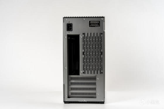 尾部右上角有abee的金属铭牌logo,顶部左侧电源延长线口,主板IO位置设计了两个8CM风扇位,PCIE挡板也作了内凹设计