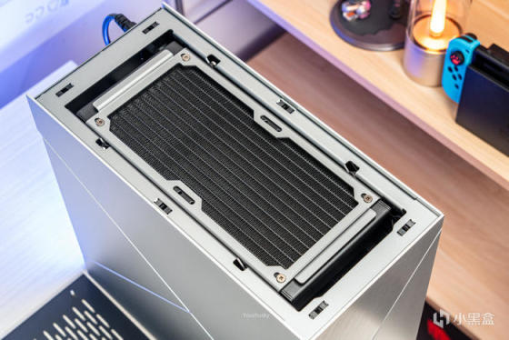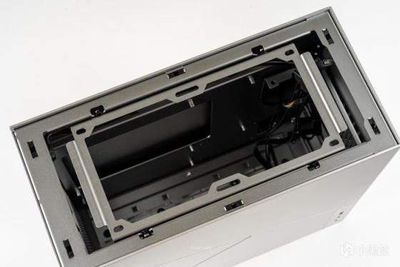 顶板打开非常方便,前后各两个碰珠固定,上提即可拆出,中间为240冷排支架;冷排支架也是全铝材质,取出方式为拉后面档条上提,抽出后前面的两个橡胶限位孔也可抽出