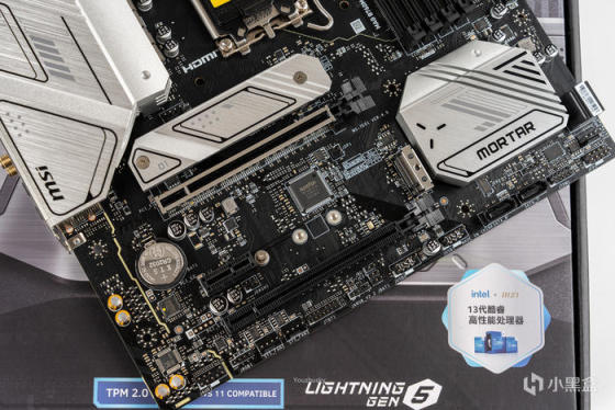 主板采用的是微星MAG B760M MORTAR WIFI 迫击炮,包装中间显示了大大的型号标识,左上角则是微星龙盾logo和三年质保800电话,右边则是intel13代和B760芯片组的双蓝标,底部则标识了TPM 2.0和WIN11兼容以及lightning GEN 5