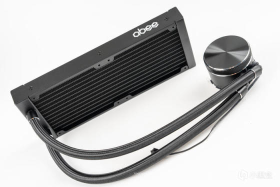 开放式方形冷排鳍片,让冷排的水道与鳍片接触面积增加,加速了热量的船体;冷排外壳为铝合金拉丝黑色阳极氧化,非常工整,而且侧边有abee的logo