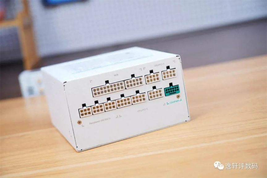 這款電源採用全模組接口設計,具有清晰的字母標識。CPU和PCIE接口是通用的,共有五個接口(滿足單卡旗艦配置),最下方是獨立的青藍色原生12VHPWR接口,其配色非常顯眼。左側是M/B區域,共有三個SATA/PATA接口。