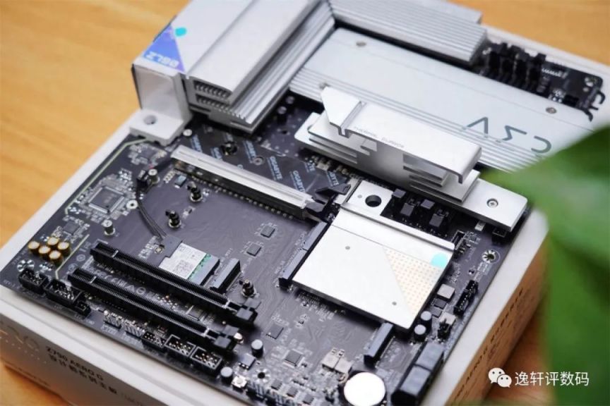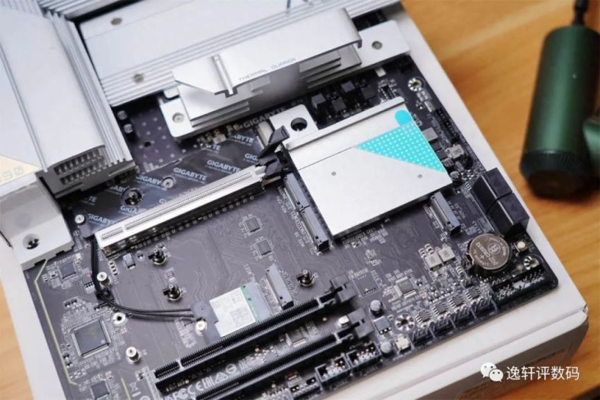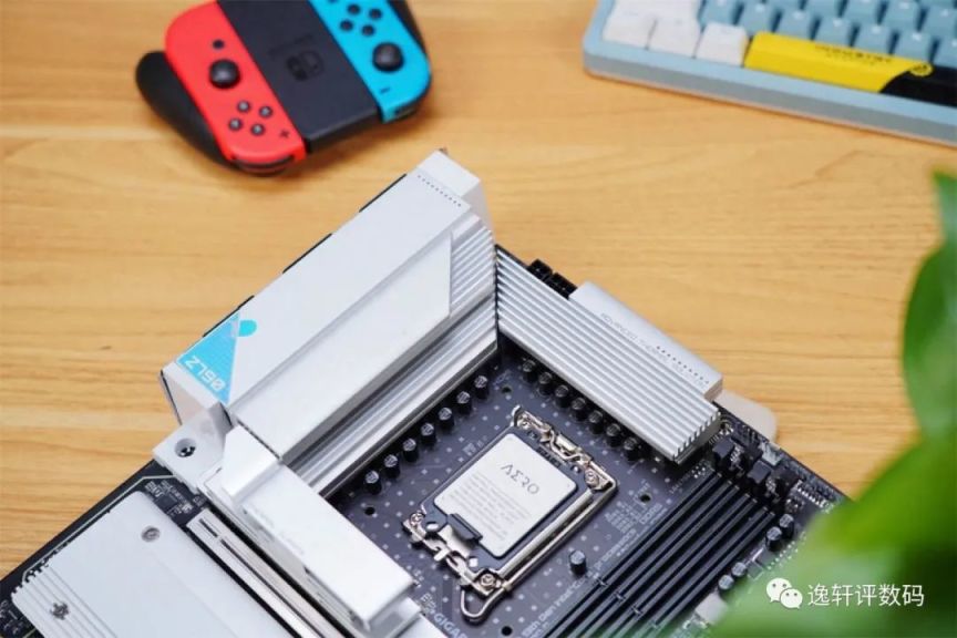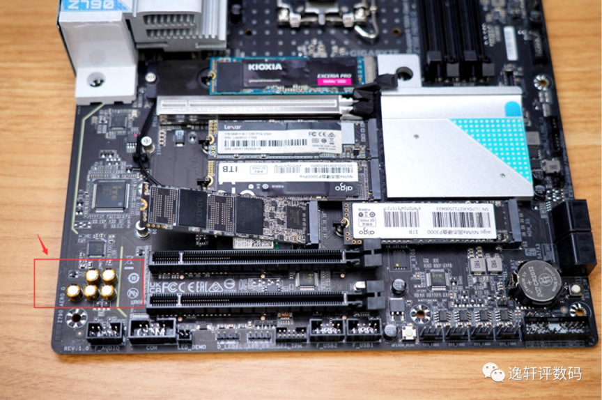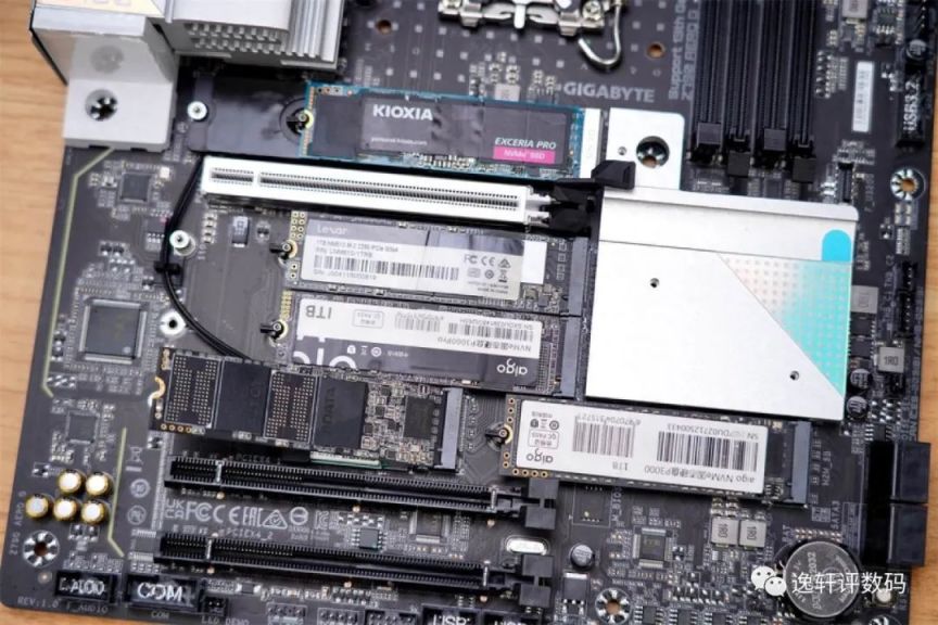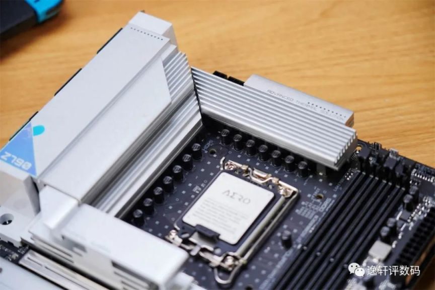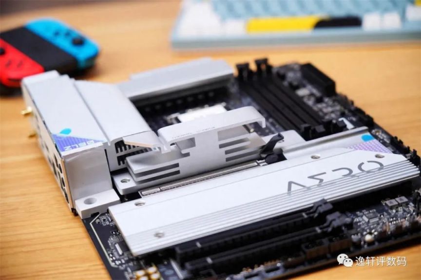 拆掉主板的散熱裝甲後,可以看到多達五個M.2硬盤接口。這些M.2接口均支持GEN5規格,並支持RAID 0、RAID 1、RAID 5和RAID 10模式,爲NVMe SSD硬盤的擴容和性能提升提供了相當出色的表現。