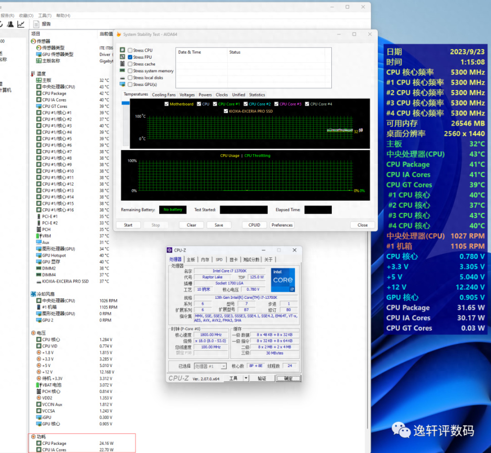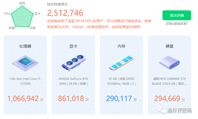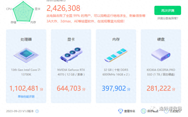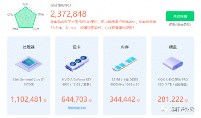 整機配置一覽,處理器是13700K,主板是技嘉的Z790 AERO G,顯卡是索泰RTX4070,整機配置非常不錯。