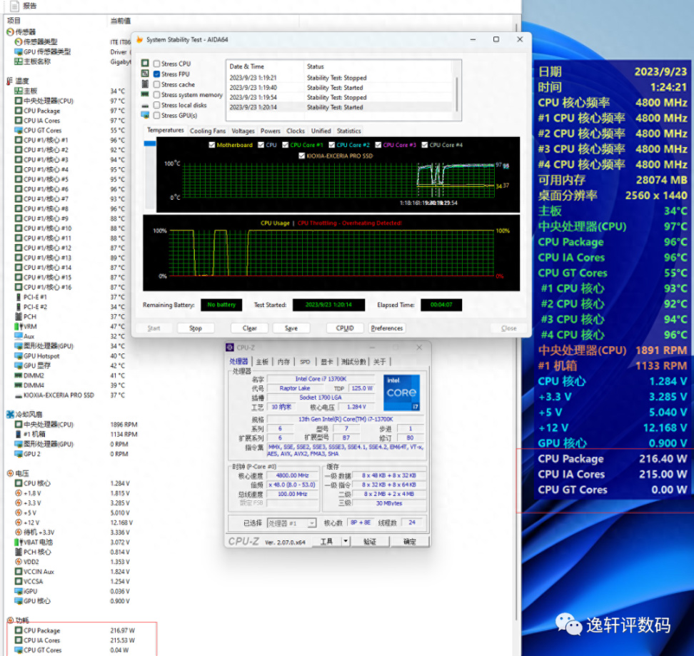 烤機測試溫度爲97℃,轉速爲1891,功耗爲216W,不知道你對這個溫度表現還滿意嗎?