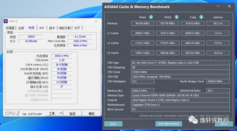 AIDA64測試,6000MHz內存讀取、寫入、複製分別爲96160MB/s、93778MB/s、91810MB/s,而延遲時間爲65.2ns。