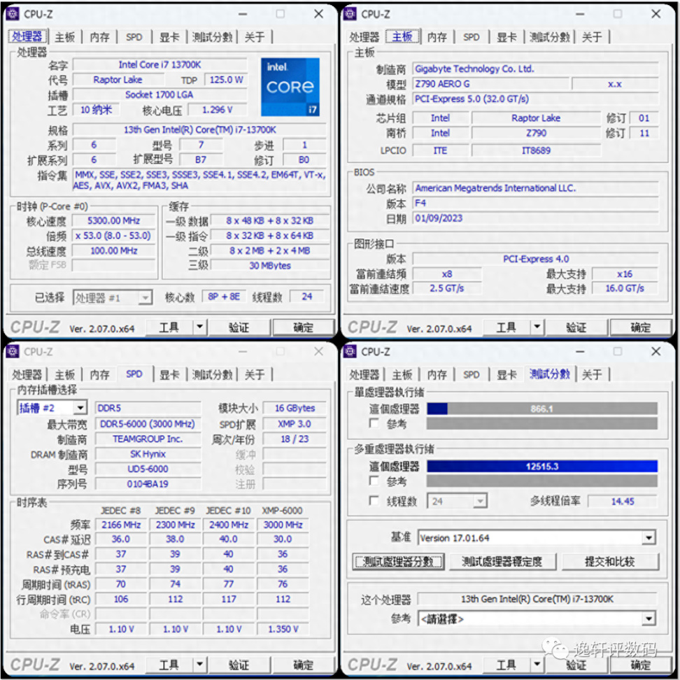 處理器爲i7-13700K設置處於默認睿頻狀態,搭載最新Windows 11 操作系統。簡單跑個CPU-Z的測試,默認設置下,單核866.1,多核12515.3,表現很不錯.