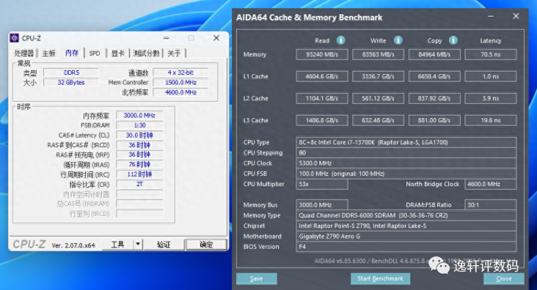 AIDA64自帶內存測試工具的測試情況,我們從測試的數據上分析,6000MHz內存讀取、寫入、複製分別爲93240MB/s、83563MB/s、84964MB/s,而延遲時間爲70.5ns。