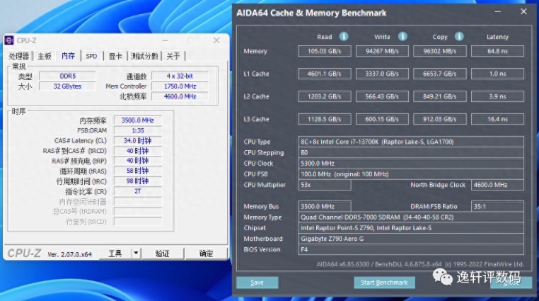 在7000MHz內存讀取、寫入、複製分別爲105.03GB/s、94267MB/s、96302MB/s,而延遲時間爲64.8ns。