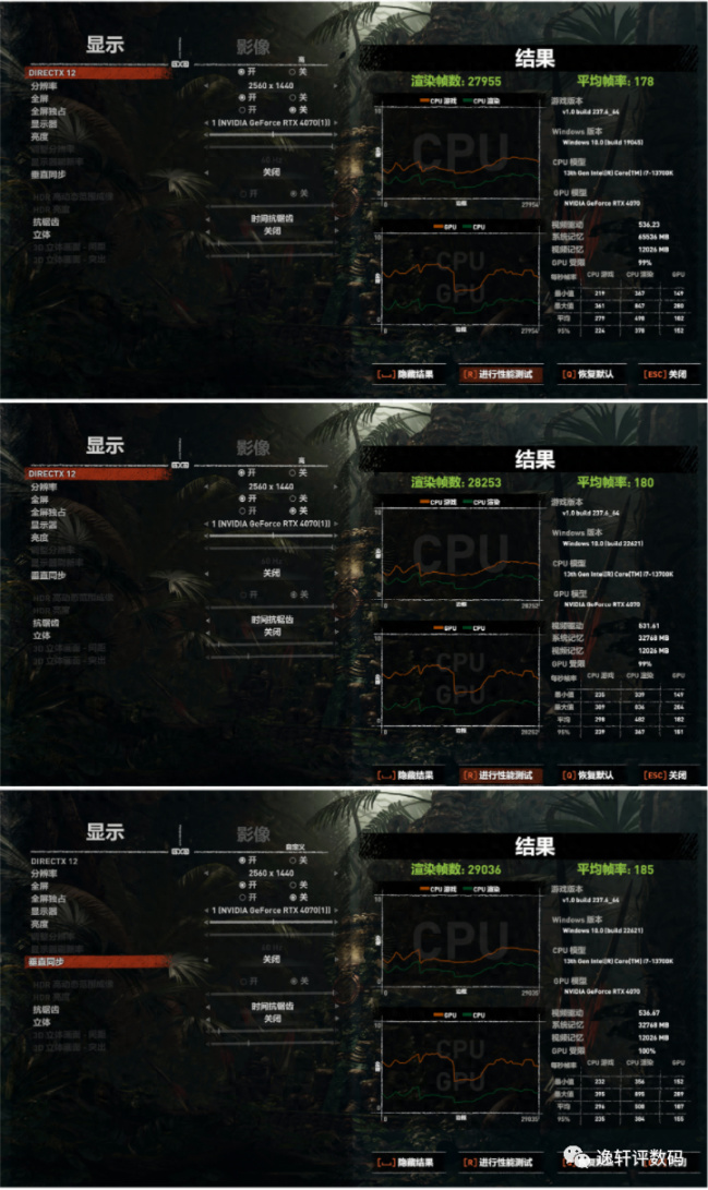 《古墓麗影:暗影》依舊畫質拉滿,2K分辨率下,遊戲測試分別爲XMP6000MHz→內存黑科技XMP6000MHz→超頻7000MHz,顯卡使用的是索泰NVIDIA GeForce RTX 4070,得出的遊戲幀率分別爲178幀--180幀--185幀。內存性能提升對於正題性能提升還是有用處的。
