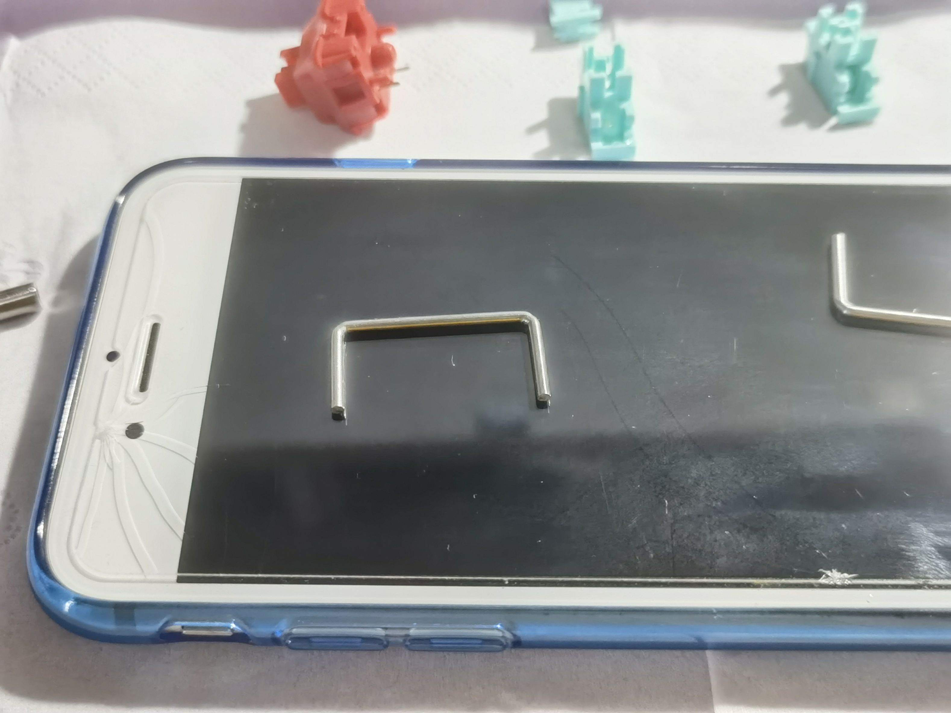 将钢丝取出来之后,先用纸巾把两端原本自带的润滑脂擦除干净,放到手机(平面)上。