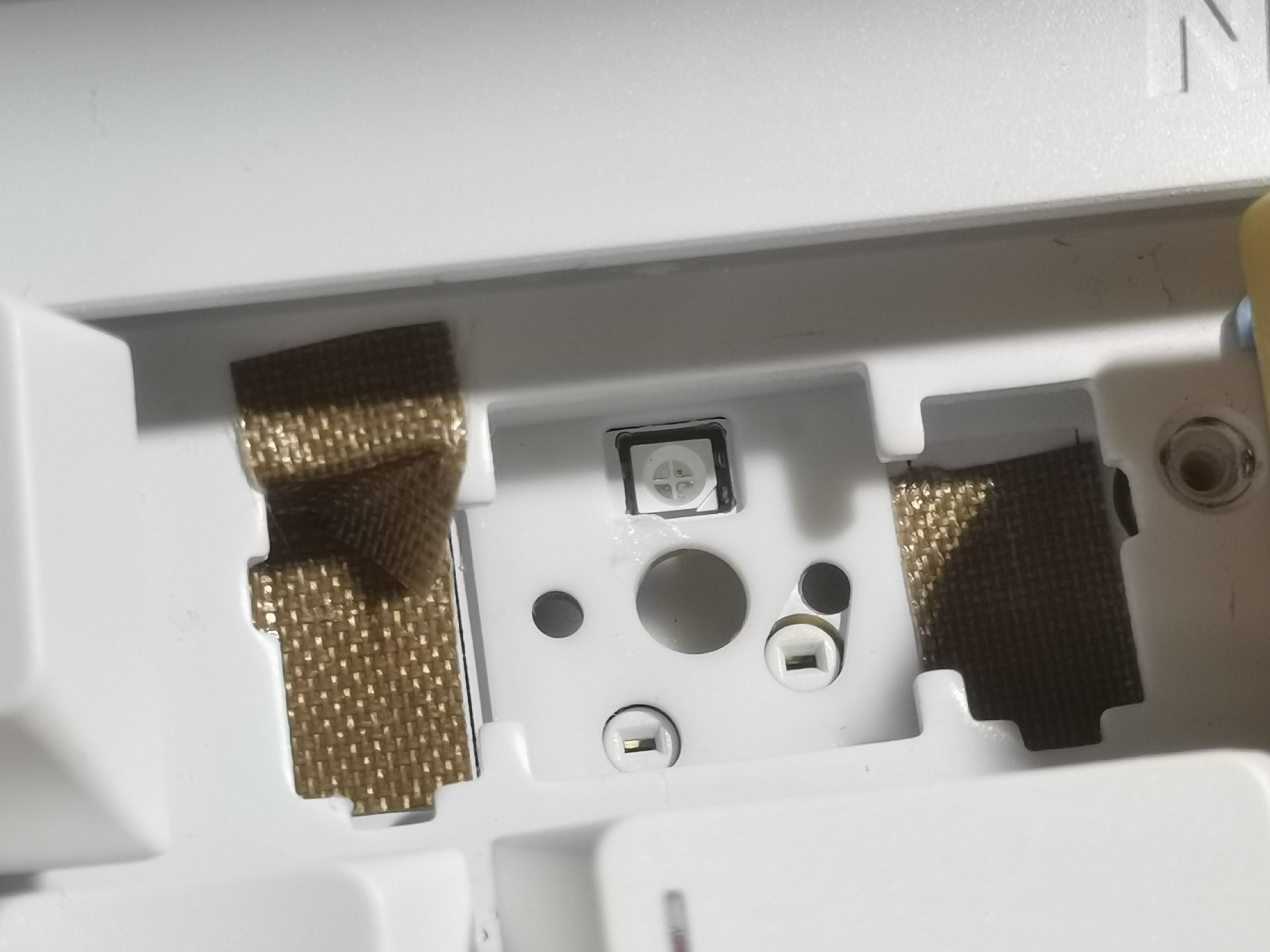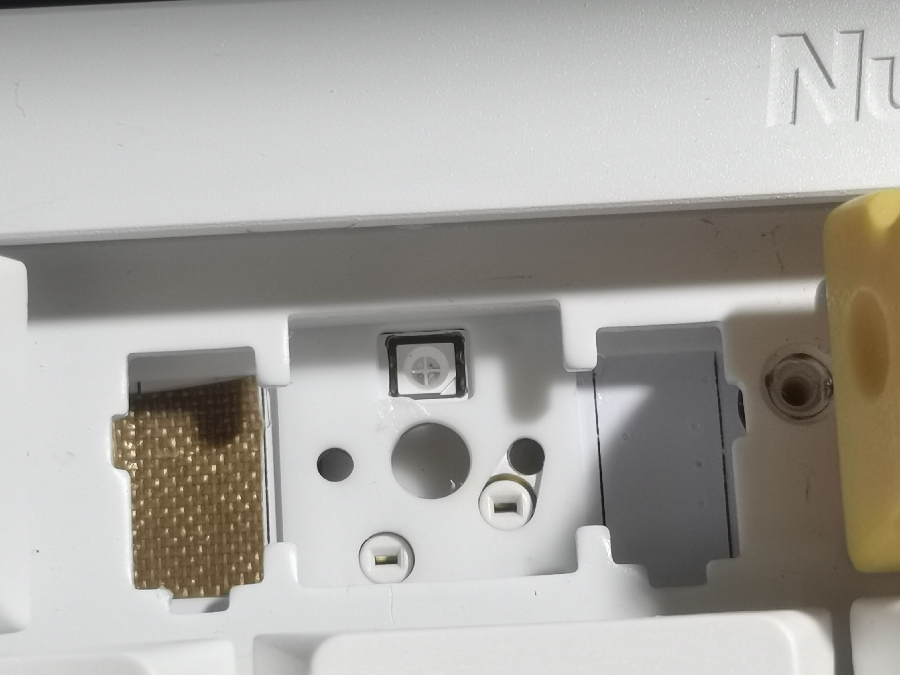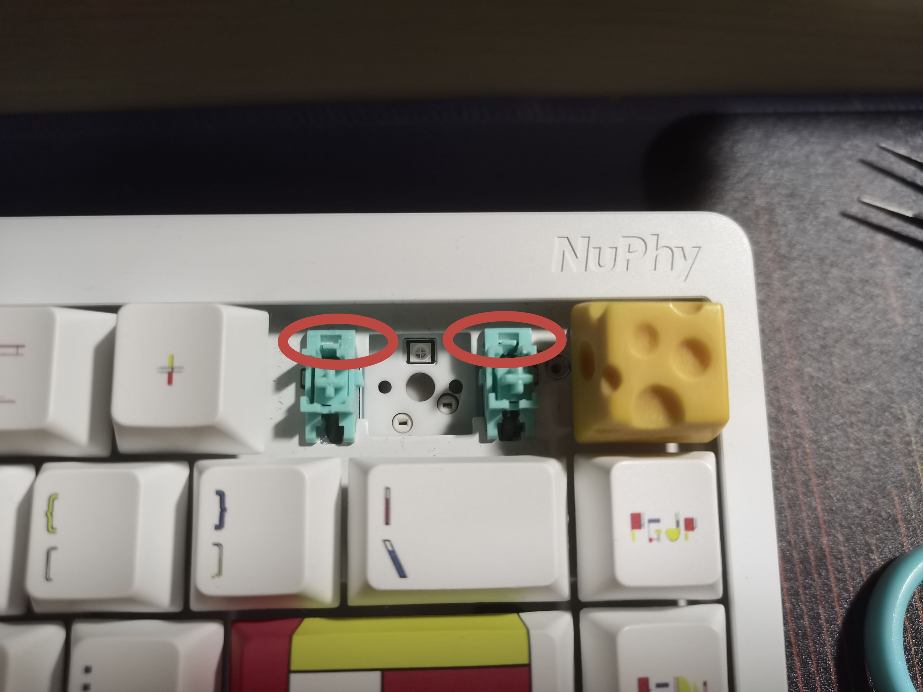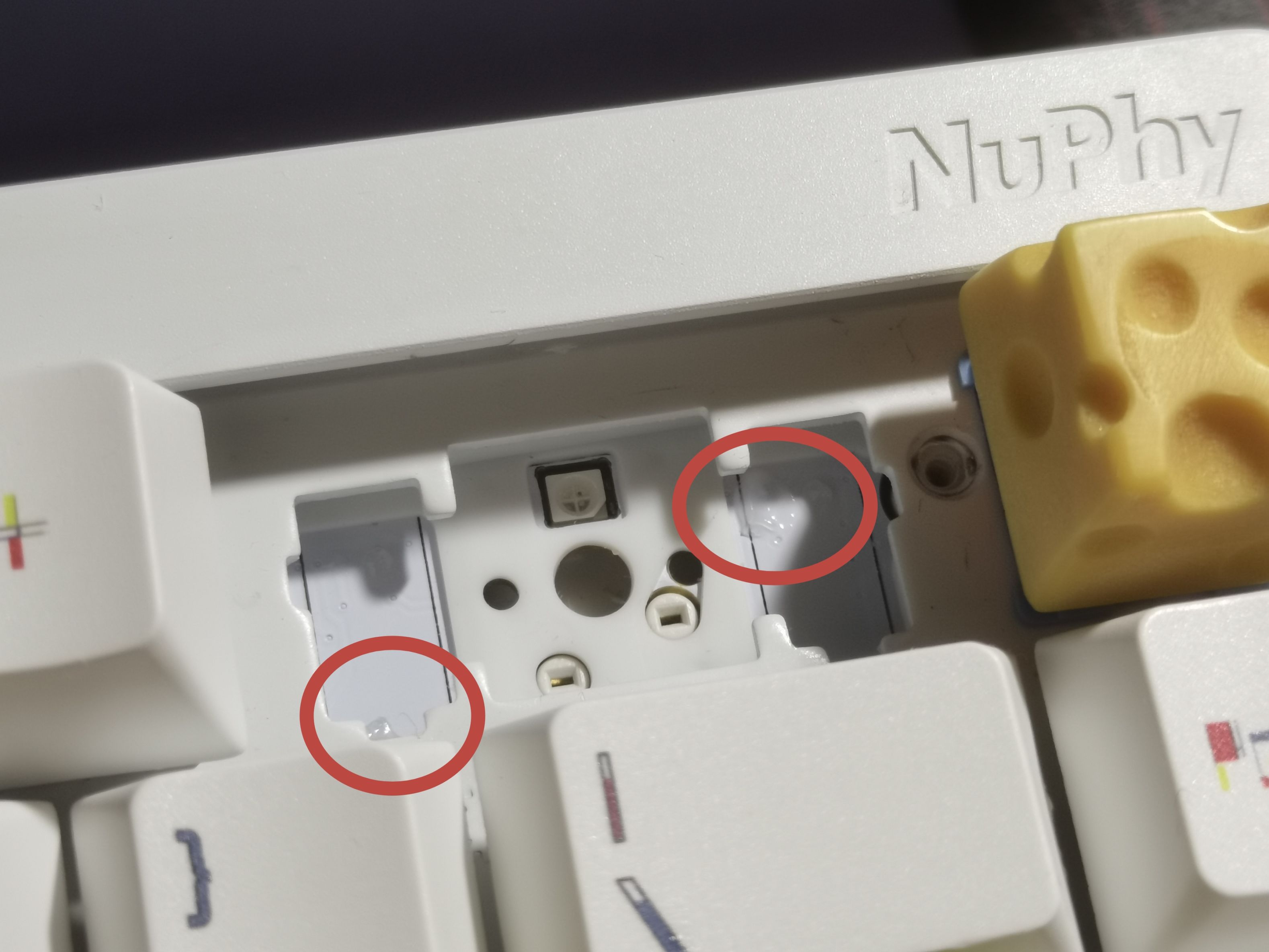 取下卫星轴后是下图这个样子,你会发现在原本假轴下方的位置,轴下垫是给你开孔的(不然大键手感会很肉)但是也正因如此,假轴和钢丝上的润脂会溢出到下面的pcb板上(下图画圈处)