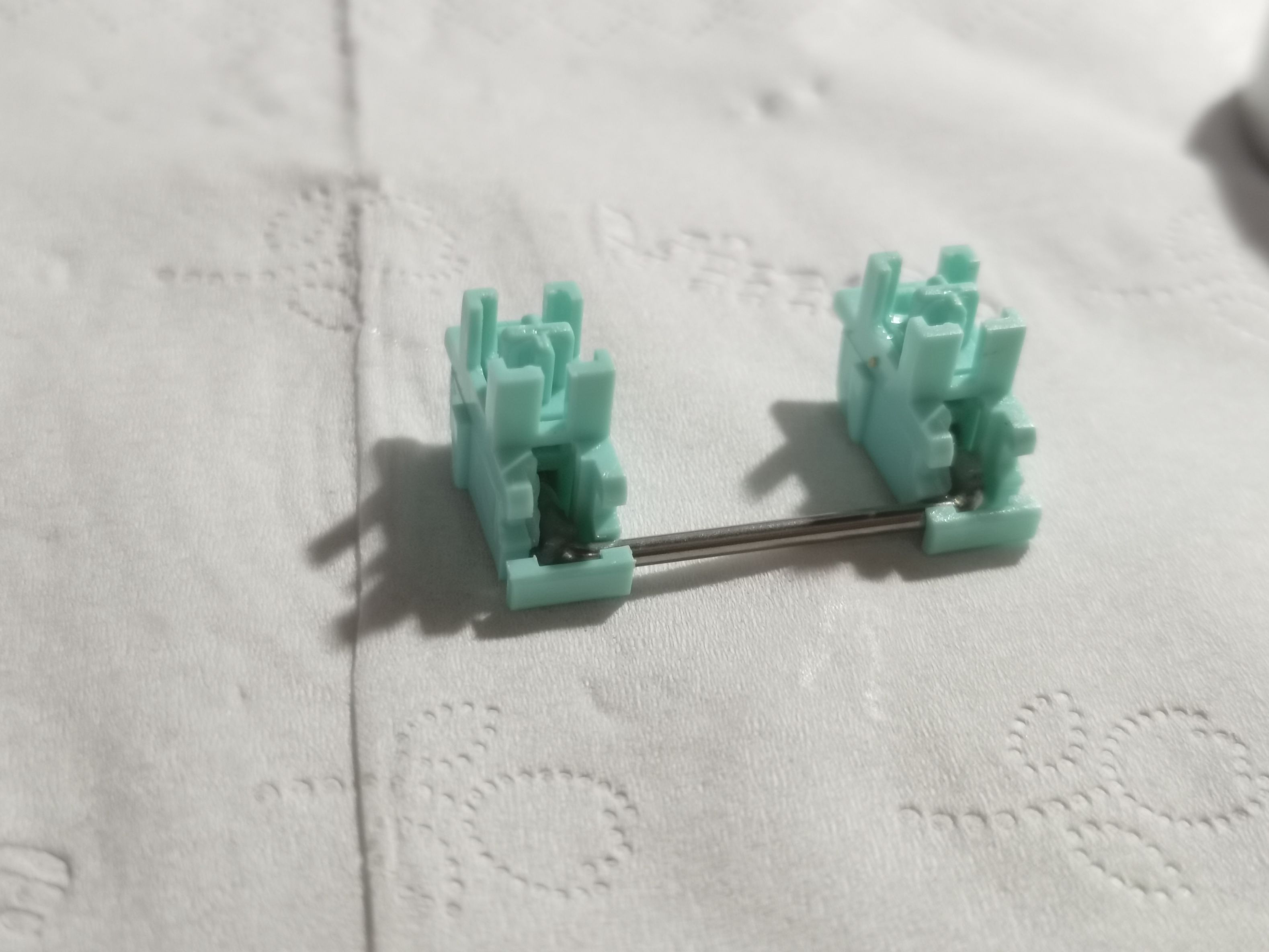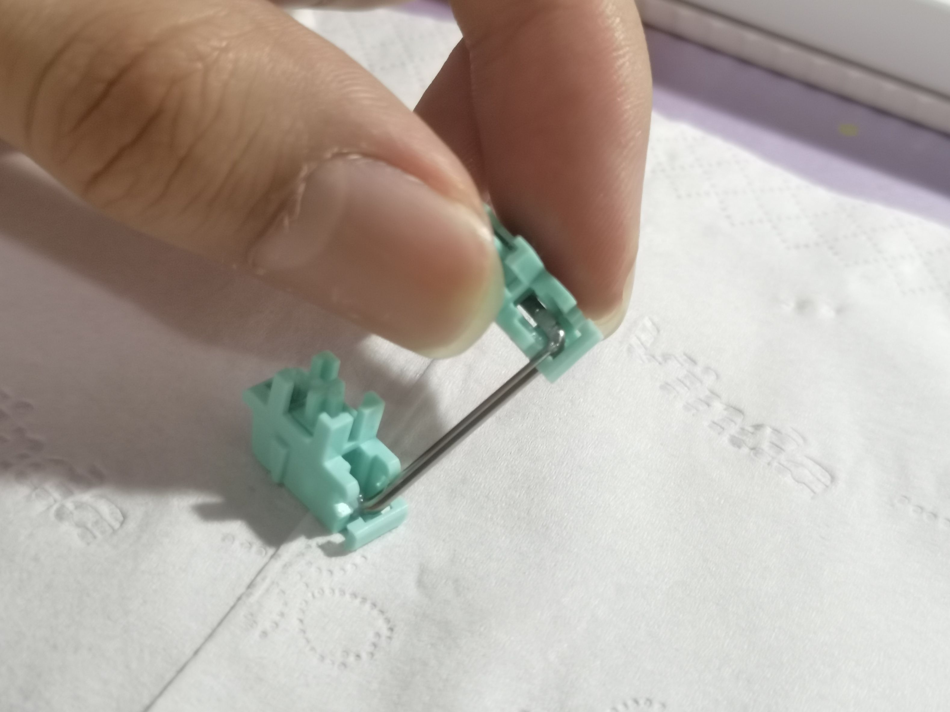 重头戏就来了——调钢丝,将矫正器插在钢丝两端,哪一端听着有杂音就说明哪一端是要稍微高于另一端的,于是乎将高的那一端向下掰,另一头向上,别用太大劲,小力多次,待到感觉差不多后再放到平面上敲击两端,若是还是不平则反复几次直到调平即可,有一点不直在之后装上键帽时都会都会有杂音。调钢丝是个需要耐心的活,有时候很会让人崩溃o(╥﹏╥)o