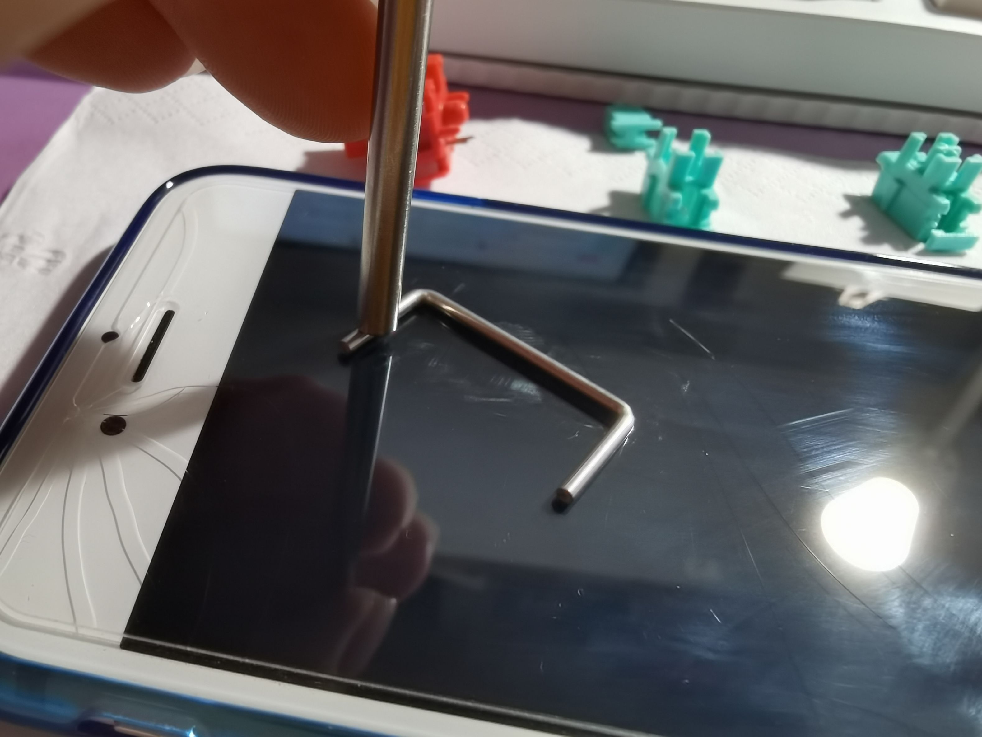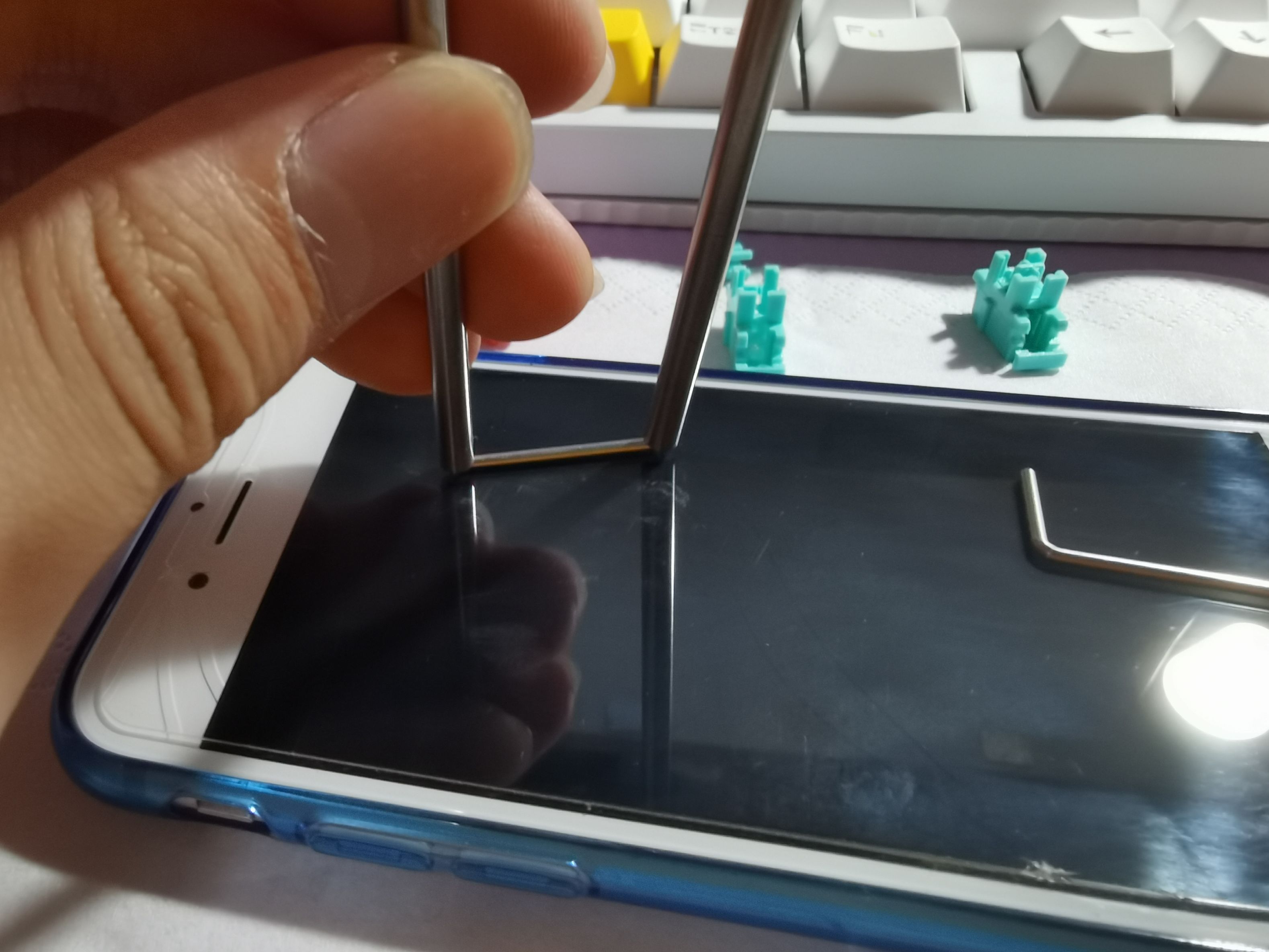 调钢丝的时候千万别把钢丝放手机钢化膜边缘往下压,别问我怎么知道的,看看裂痕就知道了