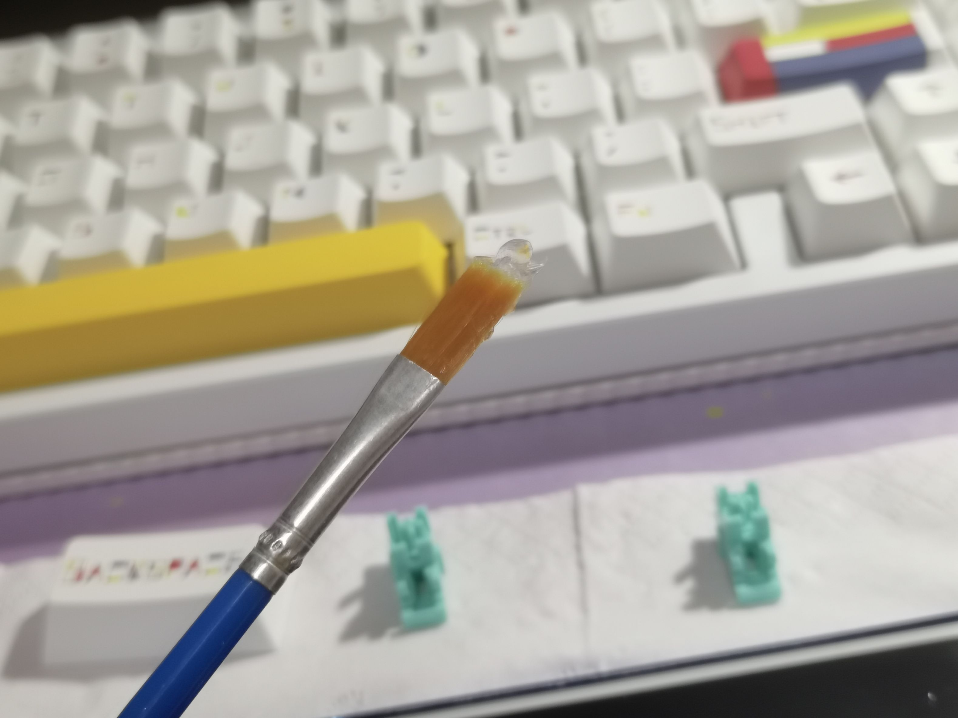 - 其次,是摸起来黏糊糊的润滑脂(记得再准备个小毛刷),用来润钢丝的,这种一般来说泰阳22058挺不错的,就是价格稍微高了一点,我是买的10g分装的,还挺耐用,图上是润了八九把键盘的卫星轴钢丝之后的量。凡士林也能拿来用。