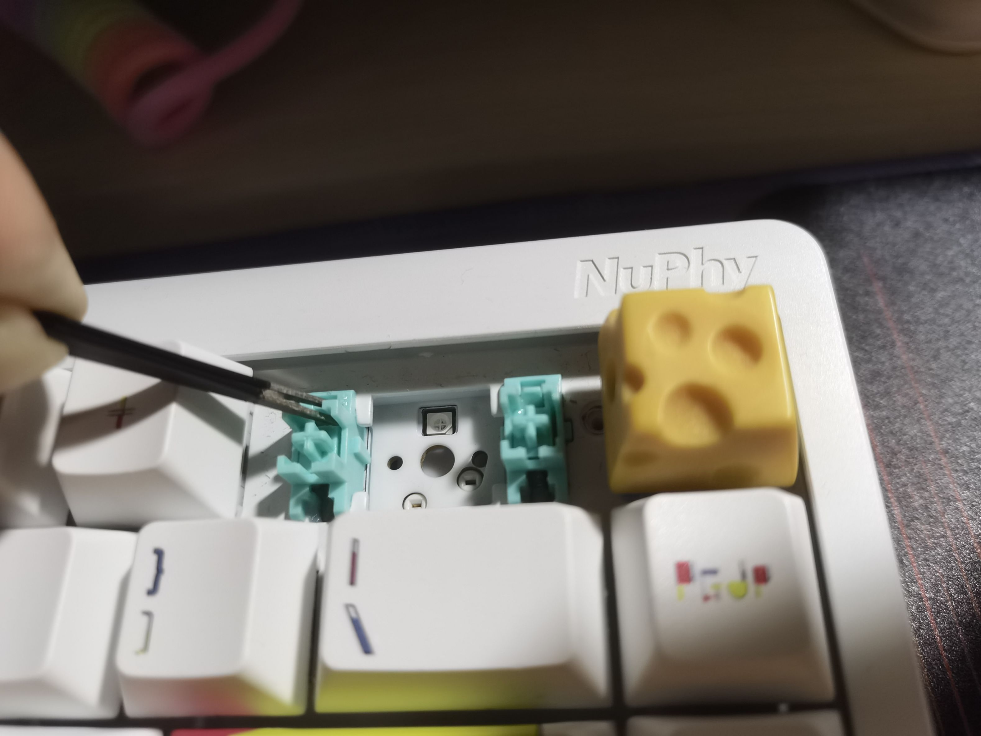 最后,再将卫星轴卡回定位板就ok了,接着就可以将轴体插回去,再安回键帽就完工了。