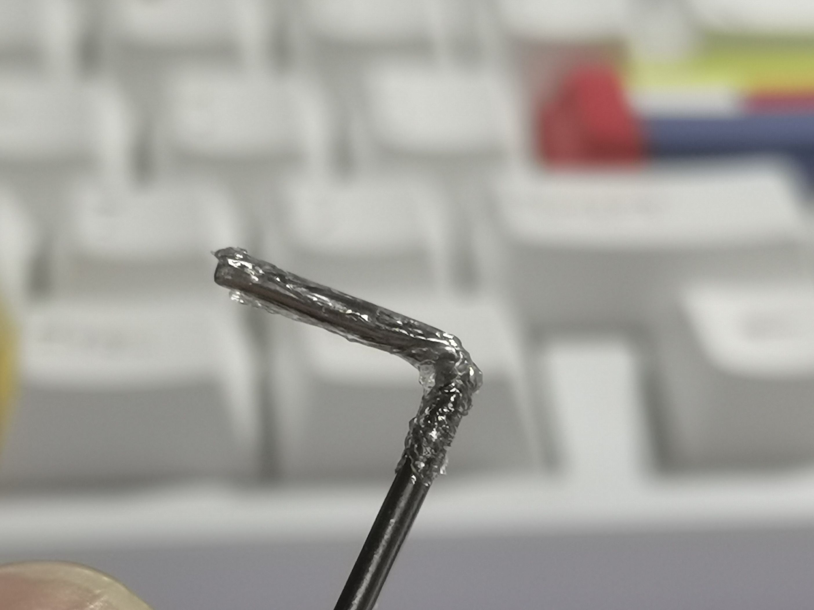 然后均匀的涂抹在钢丝的一端,记得直角处也抹上一些,如下图所示