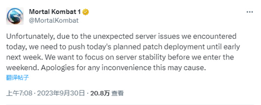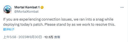 《真人快打1(Mortal Kombat 1)》近日发现一项令“玩家1”获得意外优势的BUG,引起了不少关注。NetherRealm Studios已经确认,他们计划推出一项补丁来修复这个问题。原本,这项补丁计划在昨天进行更新,但不幸遭遇了一些导致服务器问题的意外“障碍”。
