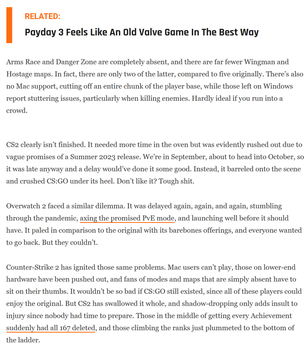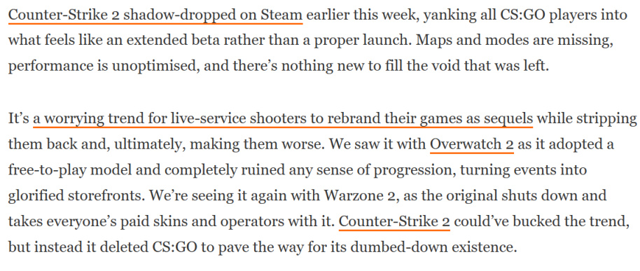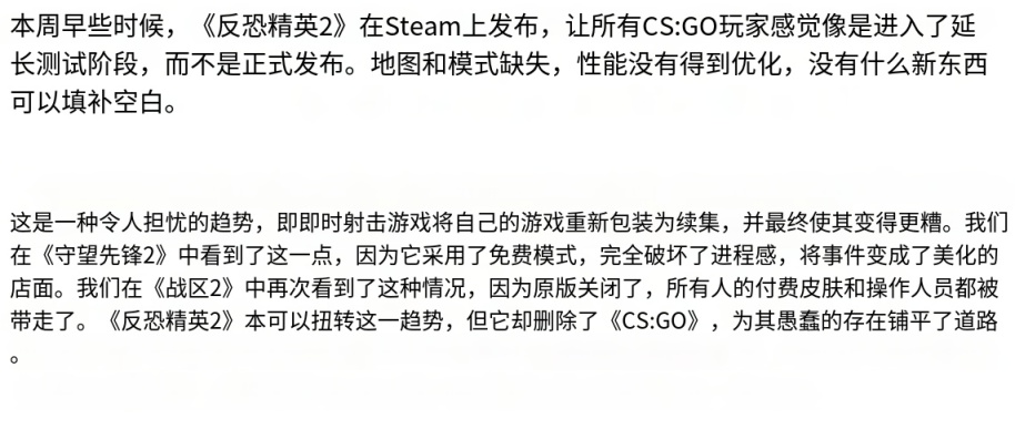 Thegamer在文章中表示:CS2地图和模式的缺失,性能未优化,卡顿现象频繁且严重,该作明显没有达到“完成”的状态。但由于官方夏季发售的承诺,也只能匆忙发布,如此看来还不如宣布延期上线。而与之相同的困境,我们也可以在《守望先锋2》身上看到:一次又一次的被推迟,砍掉PVE模式,与原版相比过于简陋,让玩家怀念过去的版本