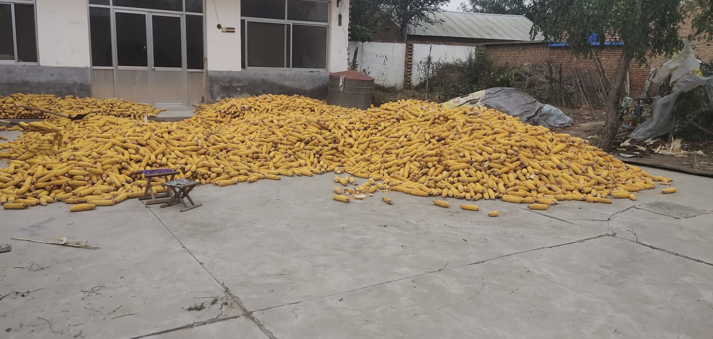 玉米直接扒拉,攤開晾曬,晾曬過的和剛收下來的顏色明顯不同。有鑑於當下玉米價格高低,可以選擇直接賣掉或者囤積起來——我家就打算晾曬一下然後囤積,所以攤開玉米的“艱苦”任務就交給我了,畢竟我奶奶身體不好,不能幹重活,就指揮我幹,而爸媽沒有假期,所以白天不在家,只能我幹,用大鐵鍬往空地上攤玉米。