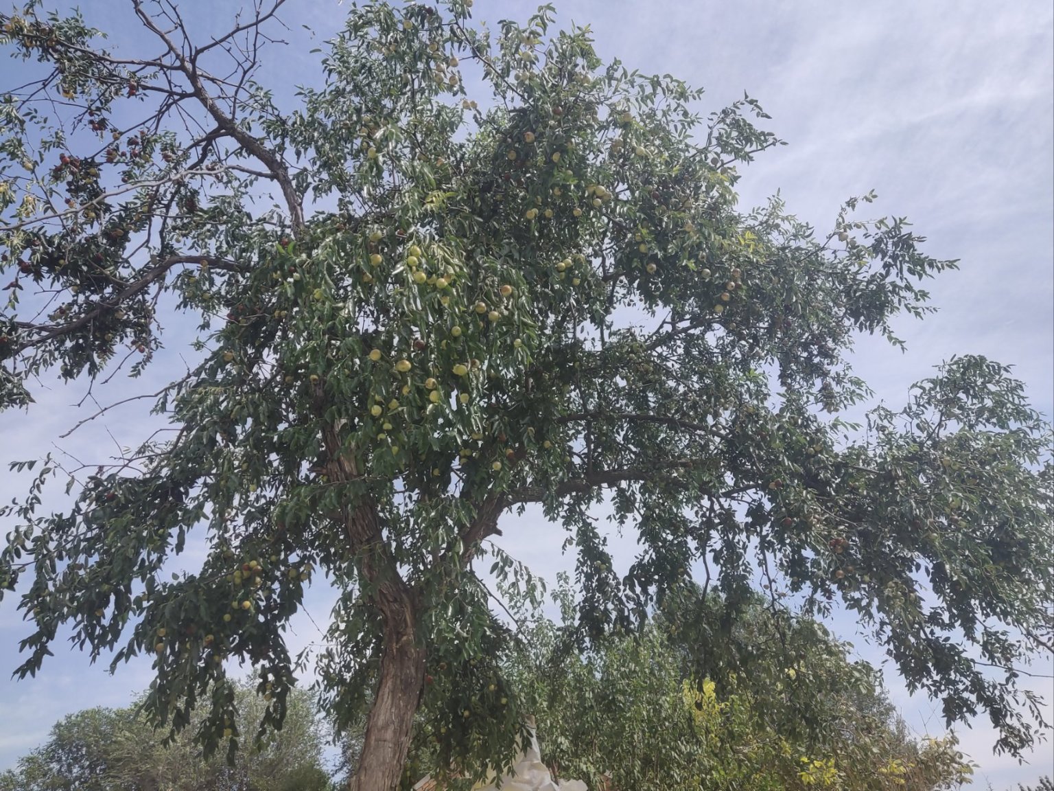 別看樹上有全紅的棗,全紅其實是告訴你棗裏有蟲,因爲蟲蛀壞了所以變紅提醒你不能喫,摘了也是發軟稀爛的棗,裏面棗核都不堪入目。