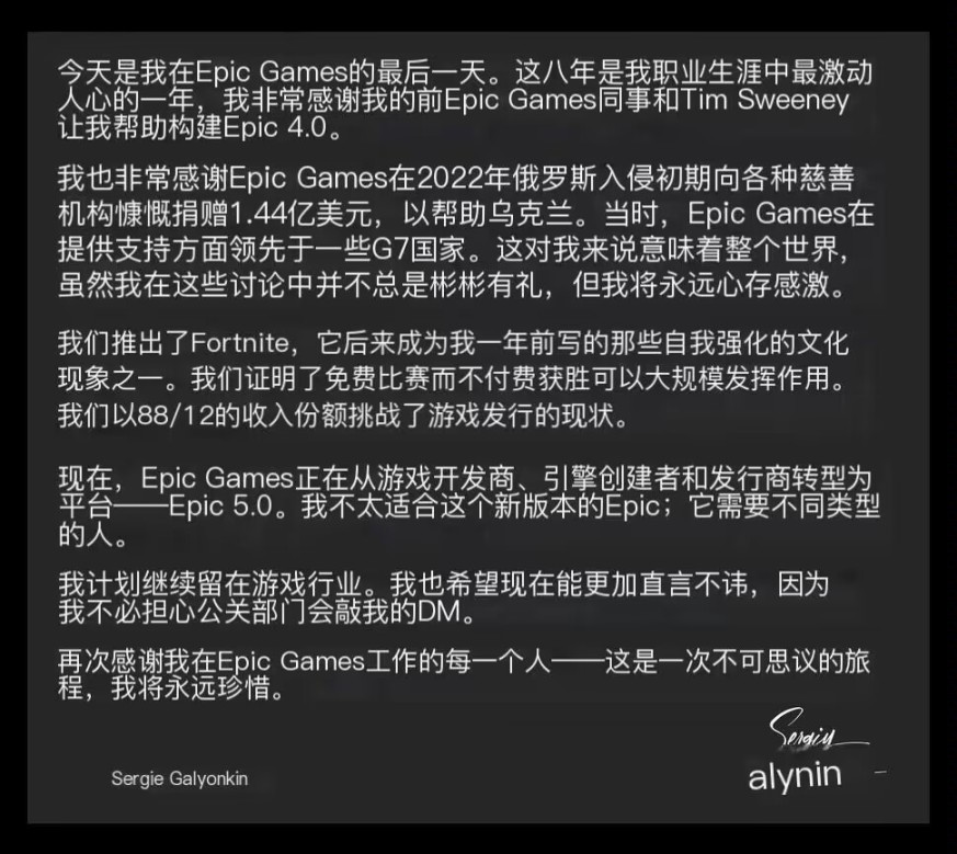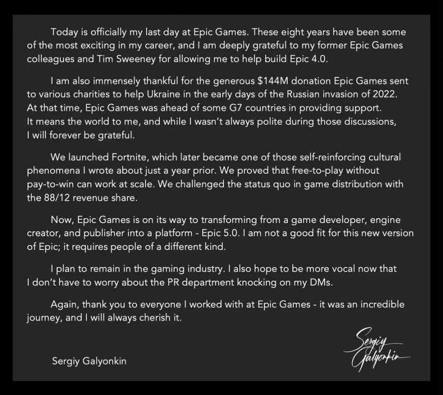 Galyonkin於2016年加入Epic,但他表示,該公司現在需要“不同類型的人”。