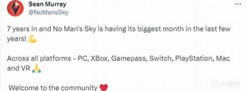 “七年过去了,《无人深空》迎来了近几年来最火的一个月!全平台都如此——PC, XBox, Gamepass, Switch, PlayStation, Mac和VR,欢迎加入社区!”