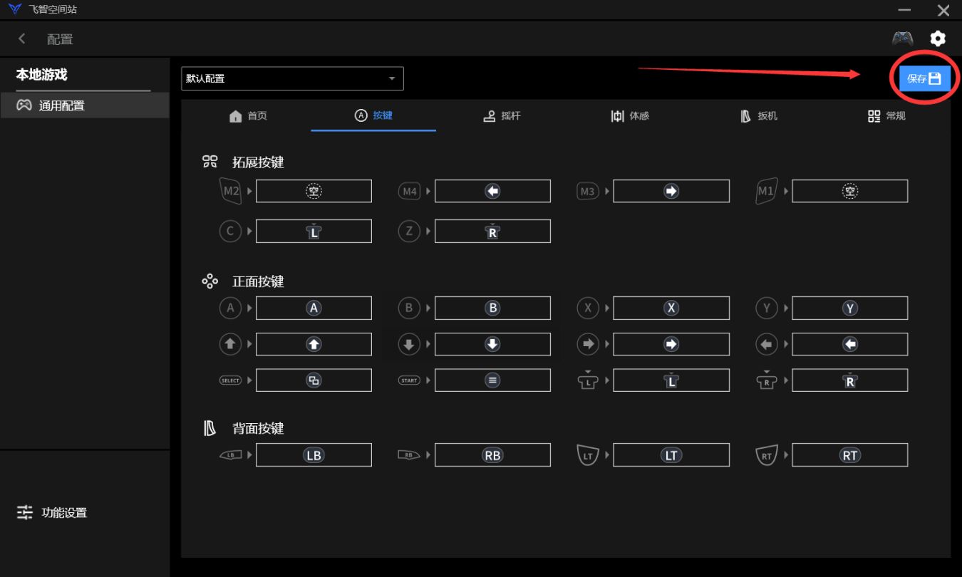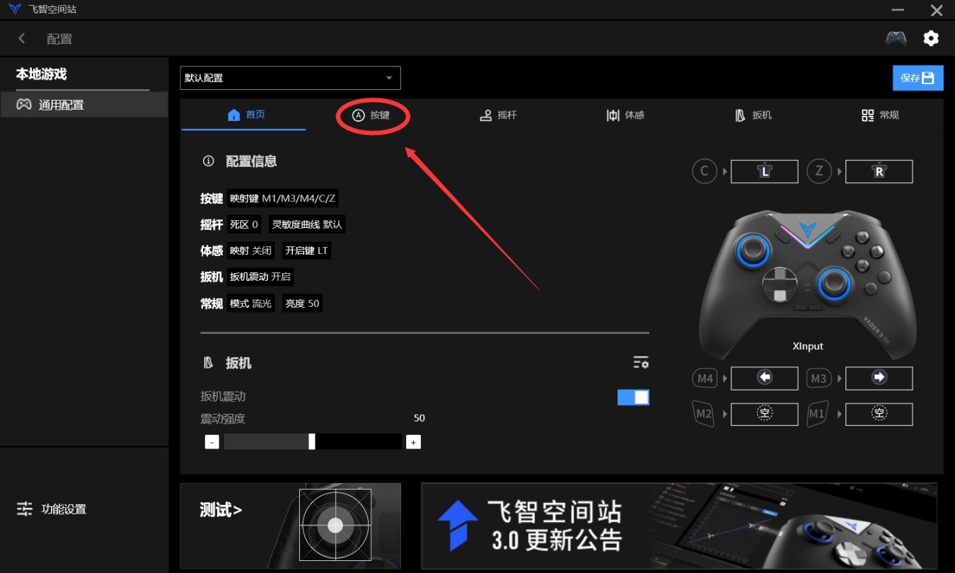 飞智空间站可修改的东西非常多,包括按键(可设置宏或连发)、摇杆、扳机、体感、灯光等,也可以设置四个不同的配置,通过手柄select键+a/b/x/y的组合,可以实现四种配置的切换。