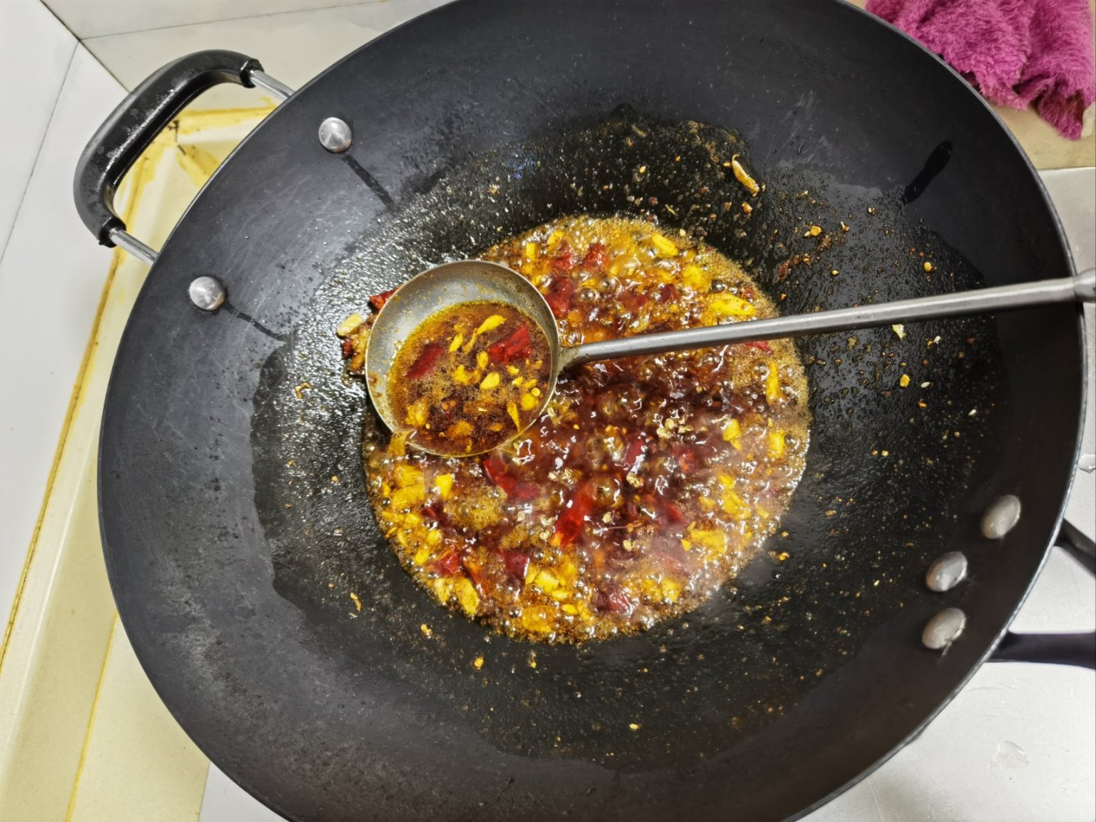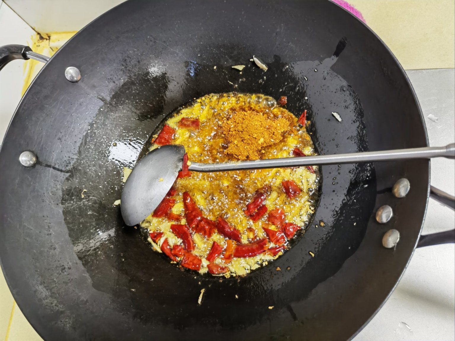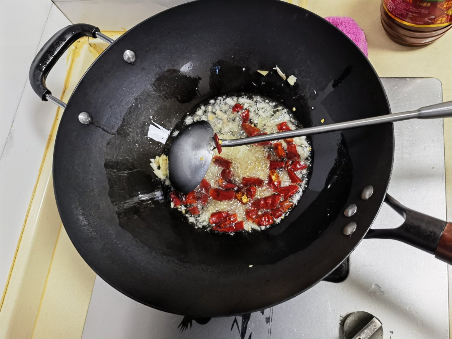 等油温到四成,即可把姜蒜末、干辣椒、花椒直接一起下入锅中,快速翻炒几下后