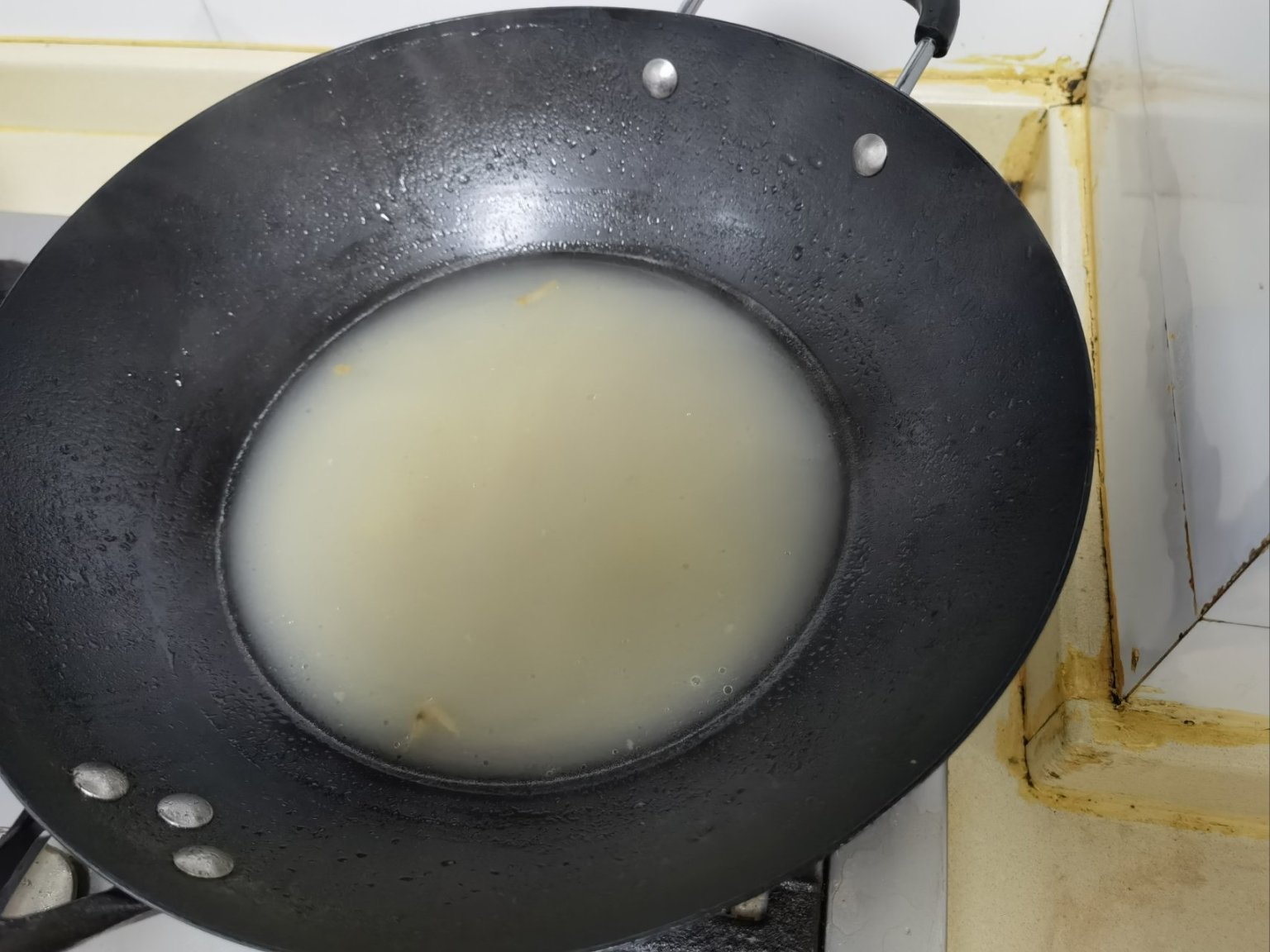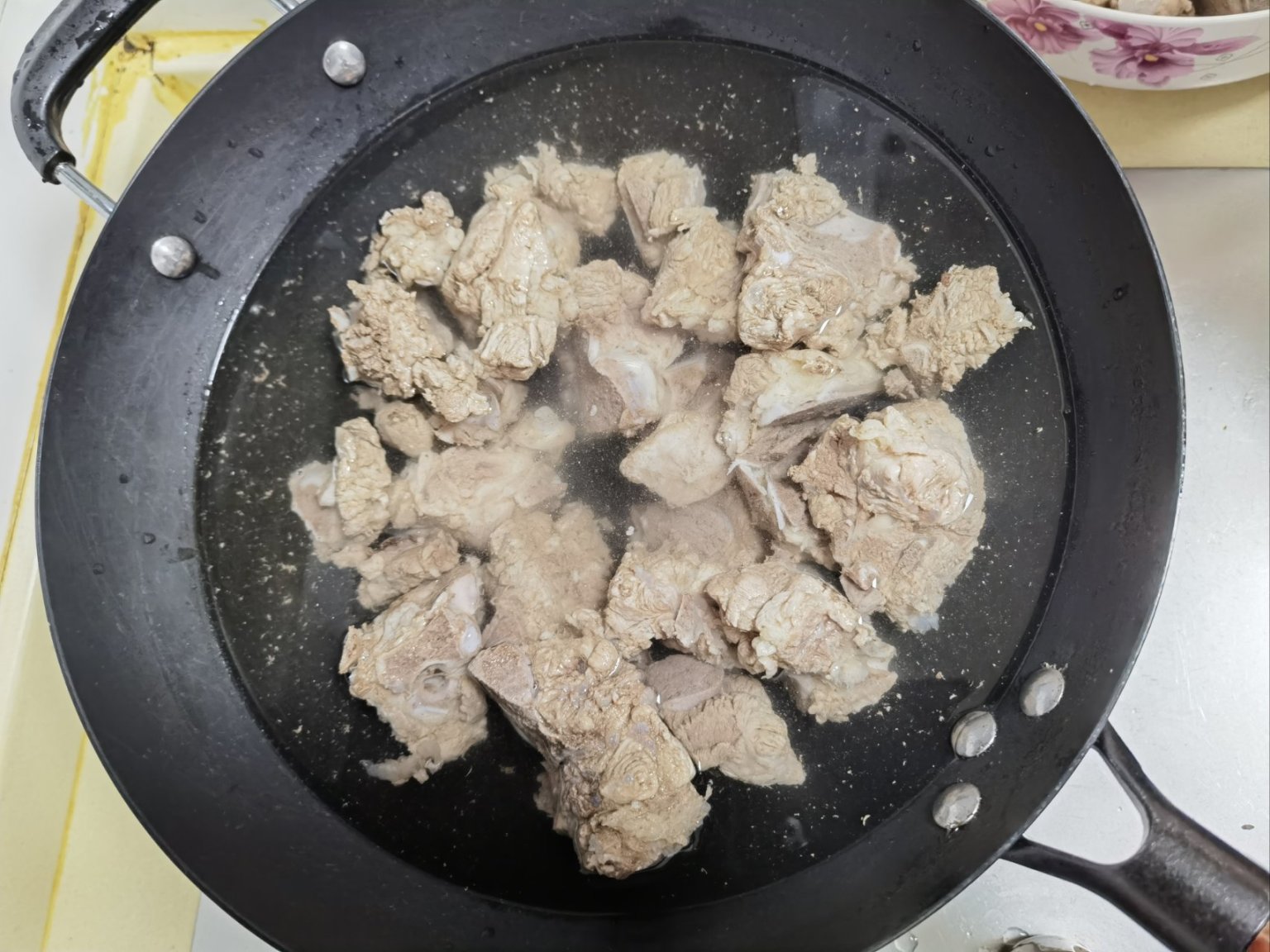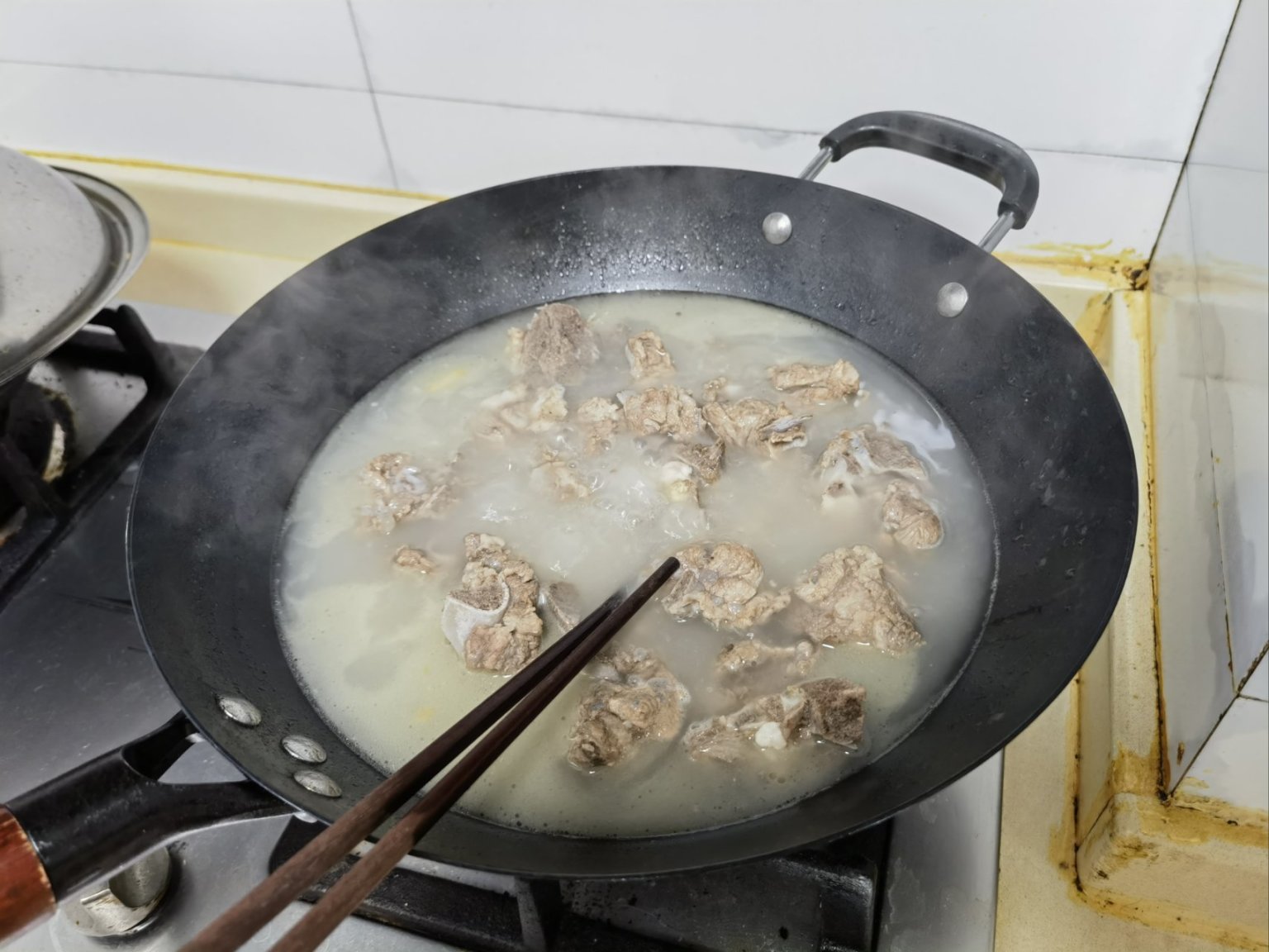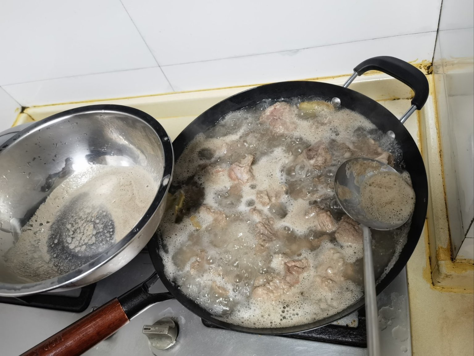 冷水下锅焯水,加入半勺料酒、五片姜片,大火煮开,煮开后撇去浮沫;