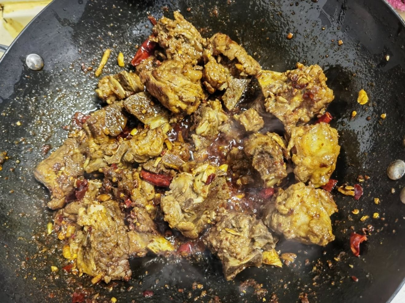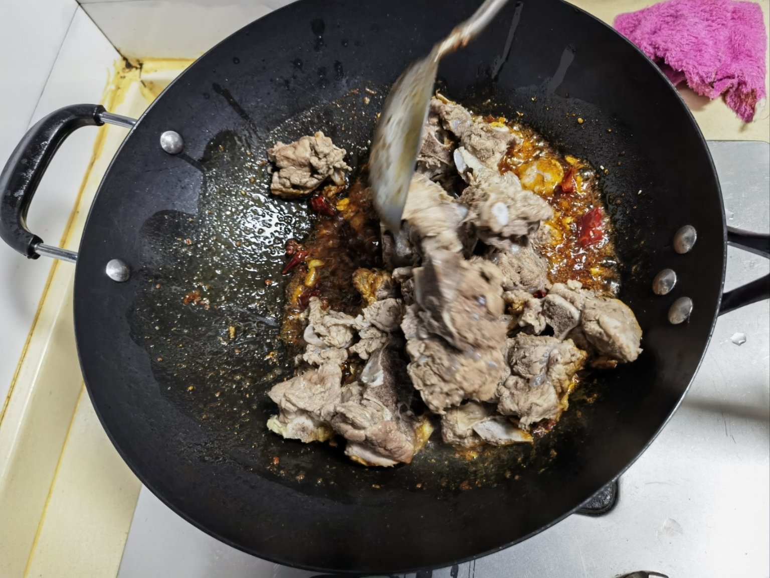 即下入小半勺豆瓣酱、大半勺辣椒面,快速翻炒几下,加入半勺生抽、半勺蚝油,炒出香味即可下入排骨,