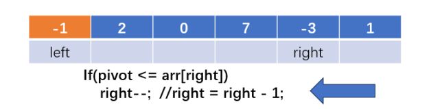 由于 -1 < 1,符合条件(条件:arr[right] >= pivot),所以我们将哨兵right左移到下一元素与pivot比较。