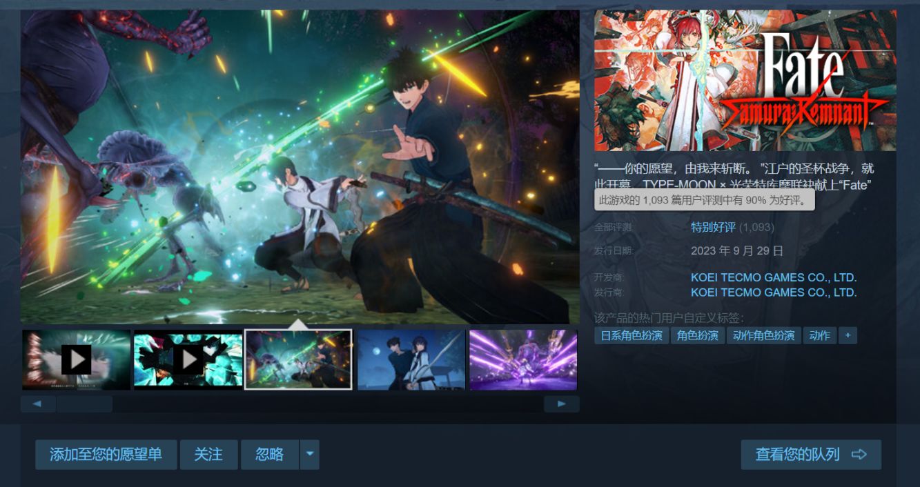 发售第四天,《Fate Samurai Remnant》商店页面好评趋近90%