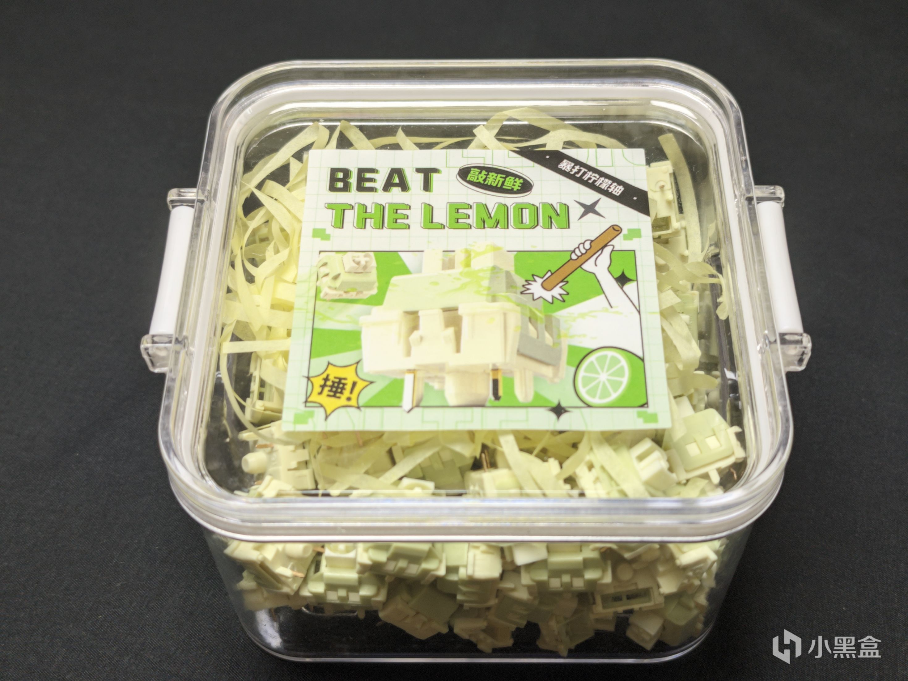 第二個是暴打檸檬軸,這三款軸體中如果說一個名字最讓人印象深刻的,那無疑就是這款了,名字無疑是蹭了前段時間某奶茶店的熱點,無論是從名字還是從軸體的外觀上,基本都看不出來這是一款輕壓力的軸體。說回包裝,雖然暴打檸檬軸採用的還是罐裝,但罐子的精美程度顯然比粉霞軸的好上不少,裏邊還能看到用了一些拉菲草來進行填充。整體的包裝水平我認爲在一元多的價位是很不錯的。