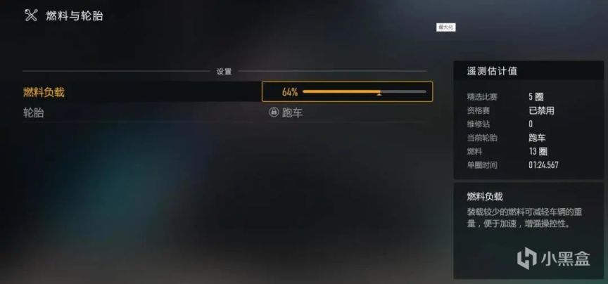 而在练习赛结束后,随着玩家选择难度的不同,这边还可以选择调整车辆的燃料、轮胎。