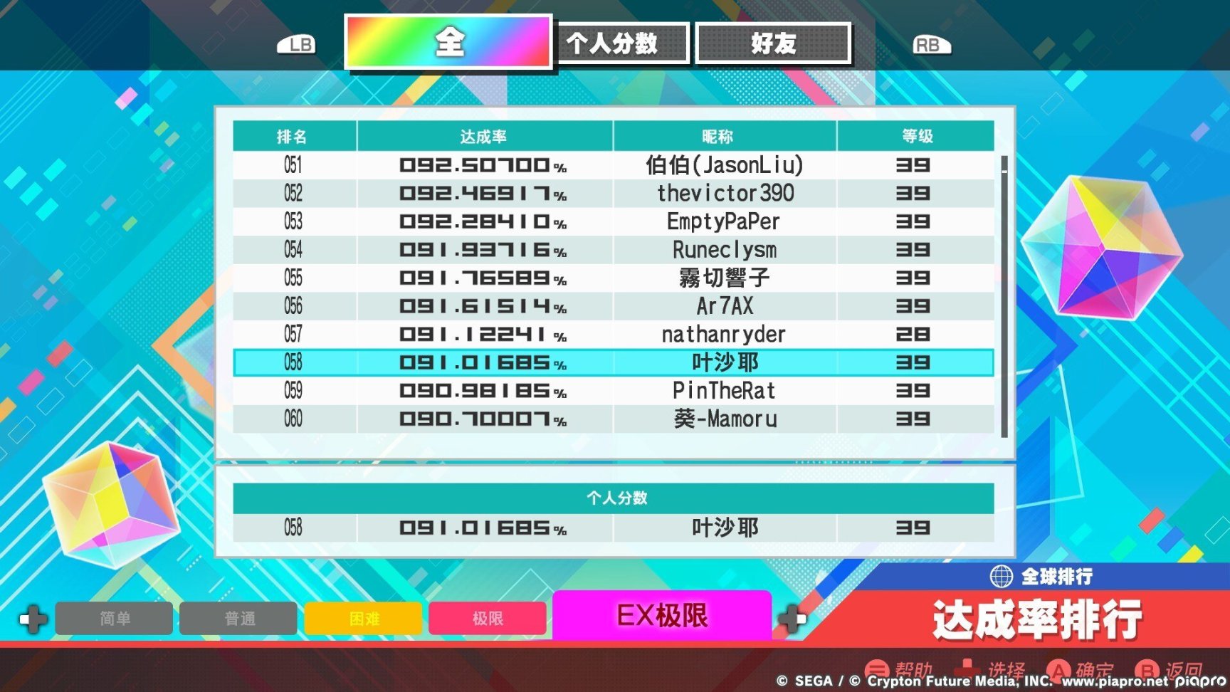 歌姬计划去年全成就的,但忘记说了,音游的话也没什么好多说的,主要就是多练,练习就有回报,全成就难度不算太高,截图是之前截的,这几天我看排名已经是60多了。