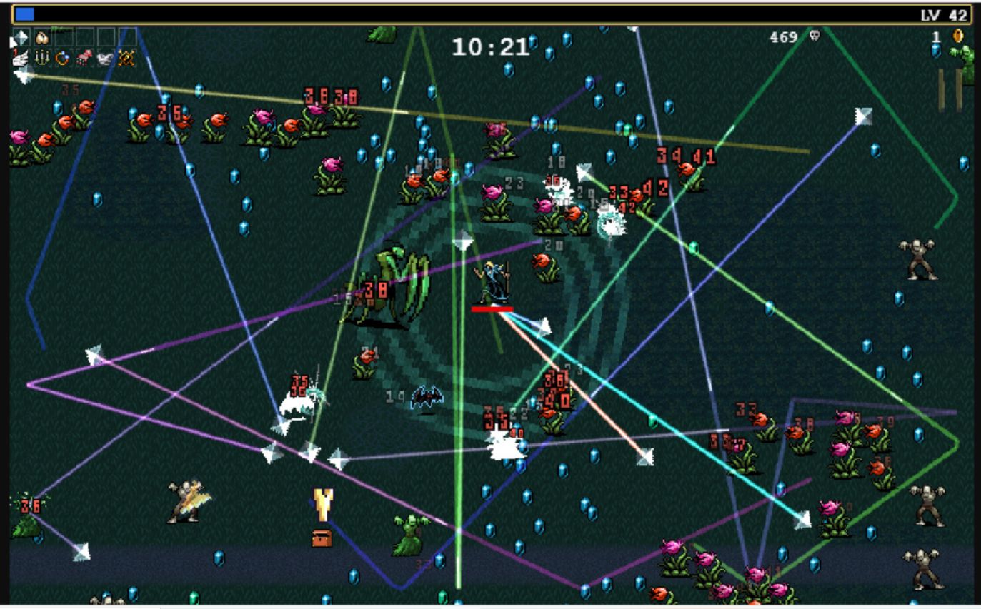 一款像素 Roguelike 的 彈幕射擊遊戲。主角攻擊釋放技能都是自動的,它主要的玩法就是控制主角進行移動,所以只需要一隻手就可以操縱。遊戲的目標,就是操控主角躲避敵人,儘可能生存更長的時間。在這段時間內,我們需要拾取敵人掉落的寶石(經驗),或者殺死boss打開掉落的寶箱,來升級武器和裝飾品。在遊玩的過程中,也能夠拾取場地內的金幣,打boss開寶箱,來收集永久類貨幣,以解鎖更多的人物和永久類增益道具,這些都會給我們下局遊戲。還有每完成一個成就,都會解鎖更多的遊戲內容
