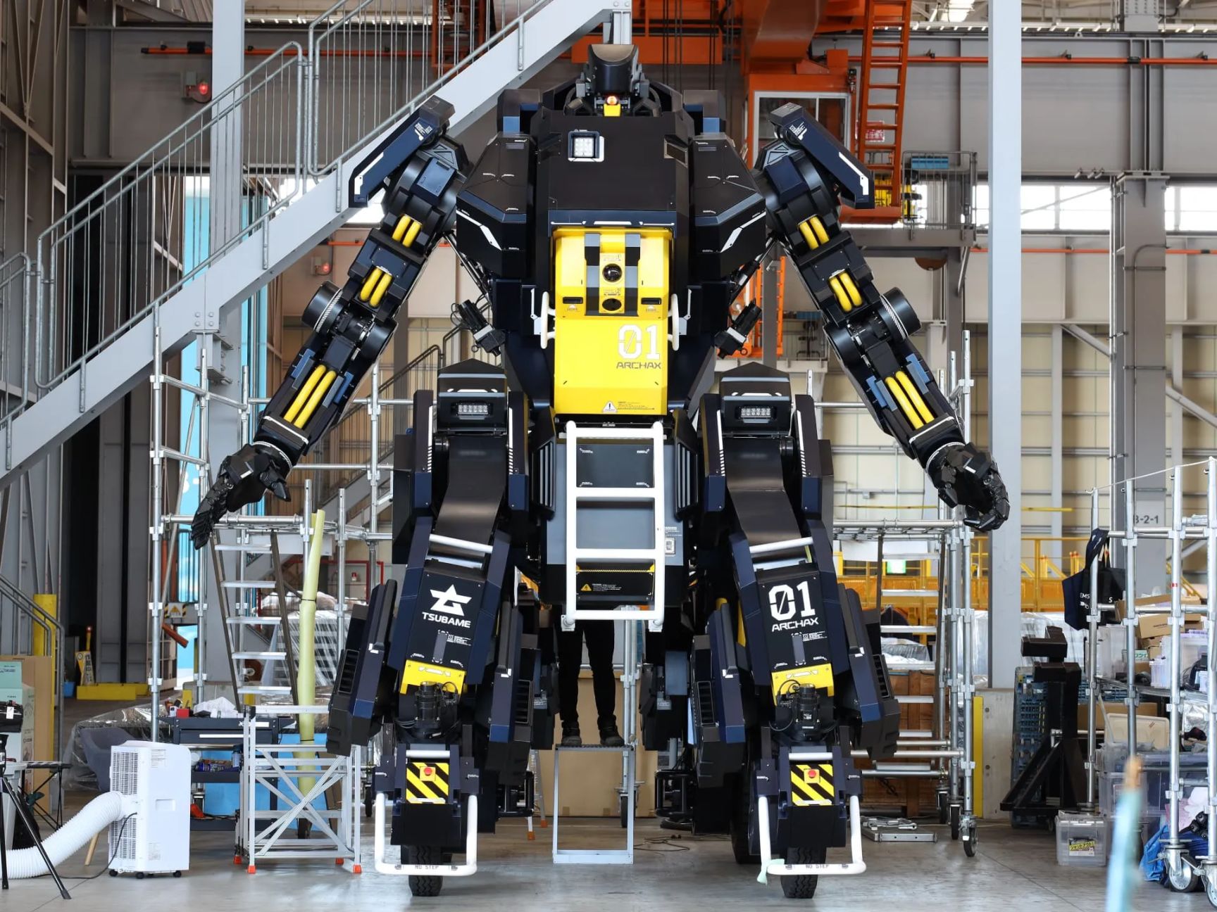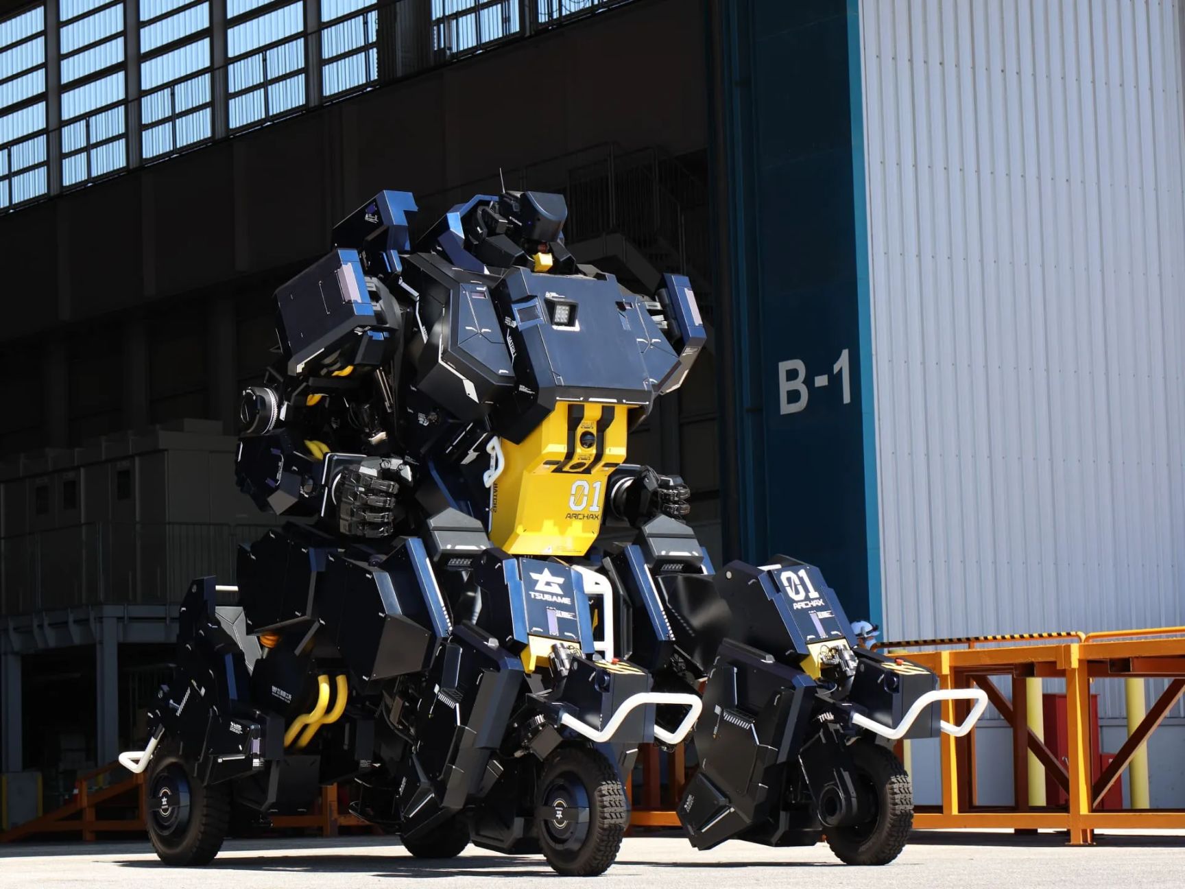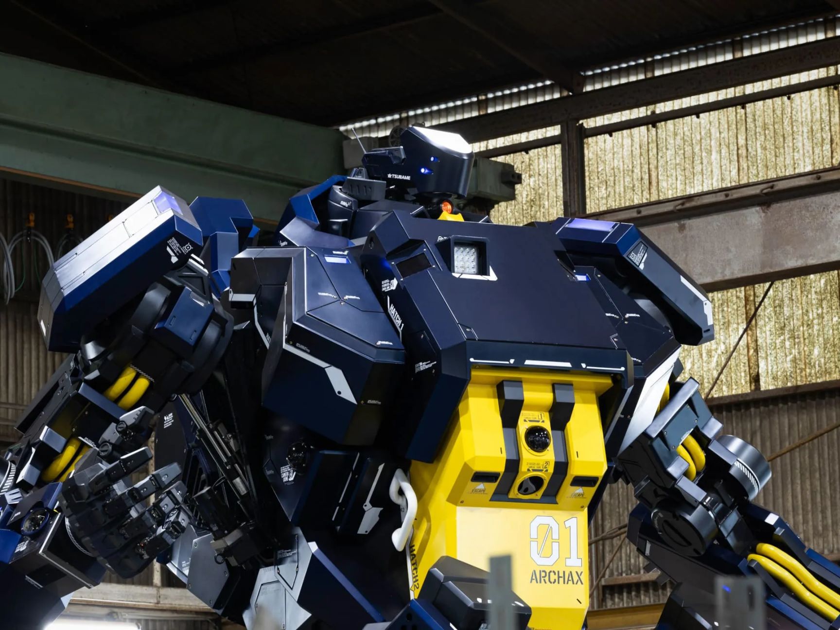 这台机器人被命名为ARCHAX,取名自鸟类恐龙“始祖鸟”。其驾驶舱内的显示器可以接收从外部摄像机传来的图像,这样驾驶员可以从机器人躯干内部使用操纵杆来控制其手臂和手。