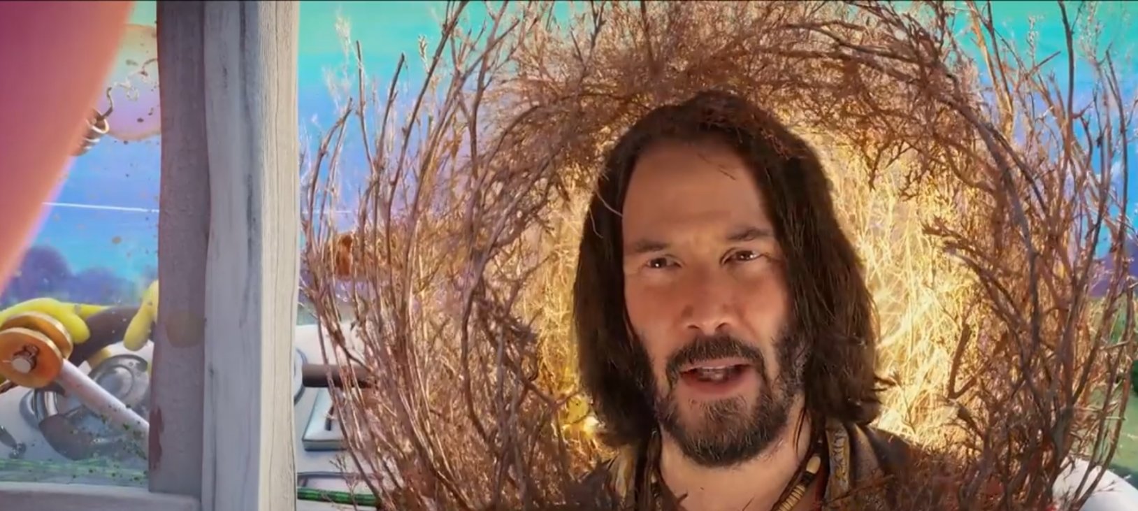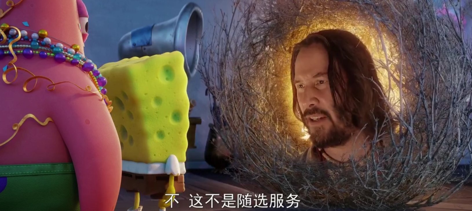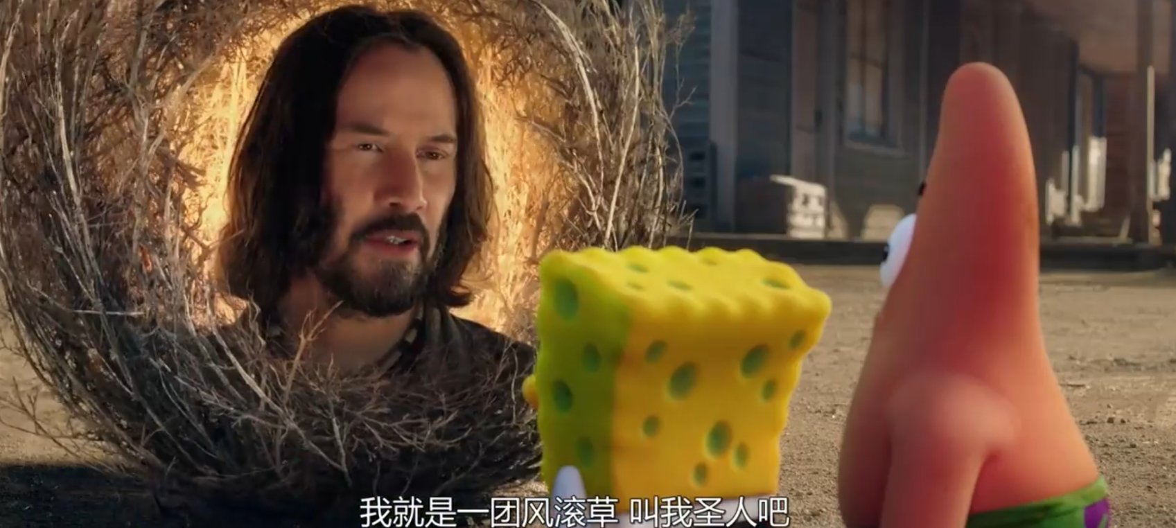 在这次观看之前,我完全没有想到会有基努里维斯真人出镜,他的脸被P在一颗风滚草上面,随着海绵宝宝一同旅行,虽然意义不明和思维不清,但是我真的每次看到基努的脸我就相当想笑,因为我前天才看完《疾速追杀4》。