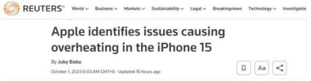报道称,苹果公司9月30日表示,已经发现一些可能导致iPhone15系列手机运行温度过高的问题,其中包括iOS17操作系统的漏洞。苹果表示,将在即将发布的软件更新中修复这些问题。