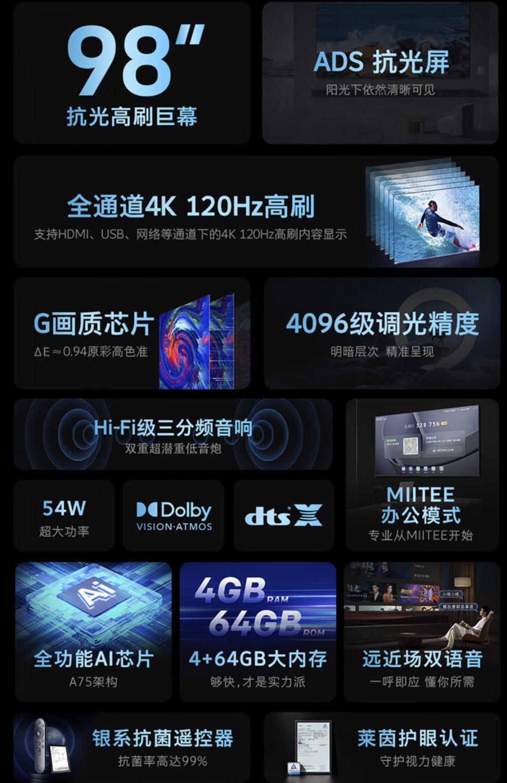 创维98A23最大的特点是ADS抗光屏,这种屏能够减少阳光造成的反光,增强观看体验,4K120Hz高刷表现也还行,但动态效果的处理上欠缺点,98A23的音响是三分频54W音响,这在同价位电视上参数还是不错的,开机有广告,但可以设置去掉。内置MIITEE办公模式,可以实现多端投屏等各种办公功能,还通过了莱茵护眼认证。