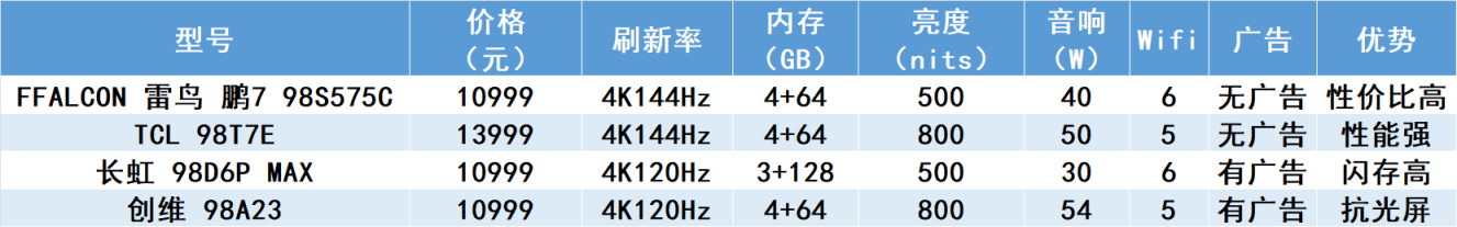 TCL是相当有资历的老品牌,自己有华星面板厂,有上游产业链优势,这是现在互联网品牌无法比的,成本控制的非常好,尤其是98寸电视,TCL也在这个尺寸上发力,T7E是TCL的高性价比系列,主打就是性价比,98T7E同样是144Hz,比雷鸟哪款强了个亮度,高了个300nits。