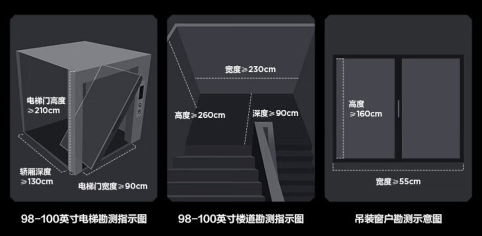百寸也不一定每个房子都适合,电视入户对电梯和楼道的空间有要求,从窗户吊装对窗户尺寸也有要求,购买时一定要查看电视信息中关于安装的要求。