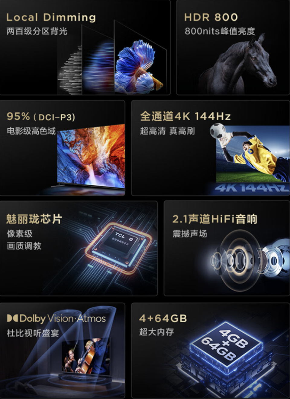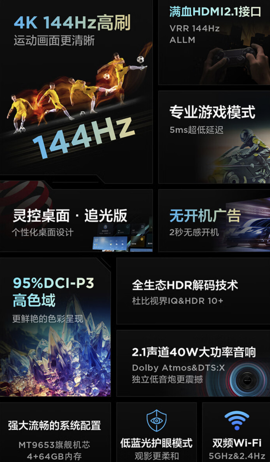 10999元|144Hz|4K|4+64GB|HDMI 2.1|5ms|95%DCI-P3|2.1声道40W|无广告|WiFi 6