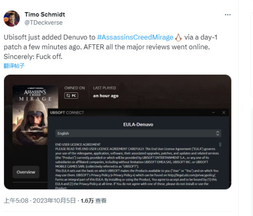 推特博主TDeckverse發現,《刺客信條:幻景》首日補丁偷偷爲本作的PC版加入了D加密,而育碧在官方更新日誌中沒有提到D加密,
