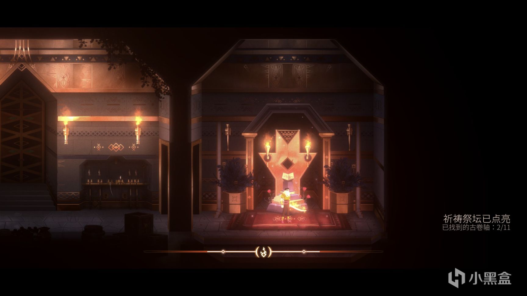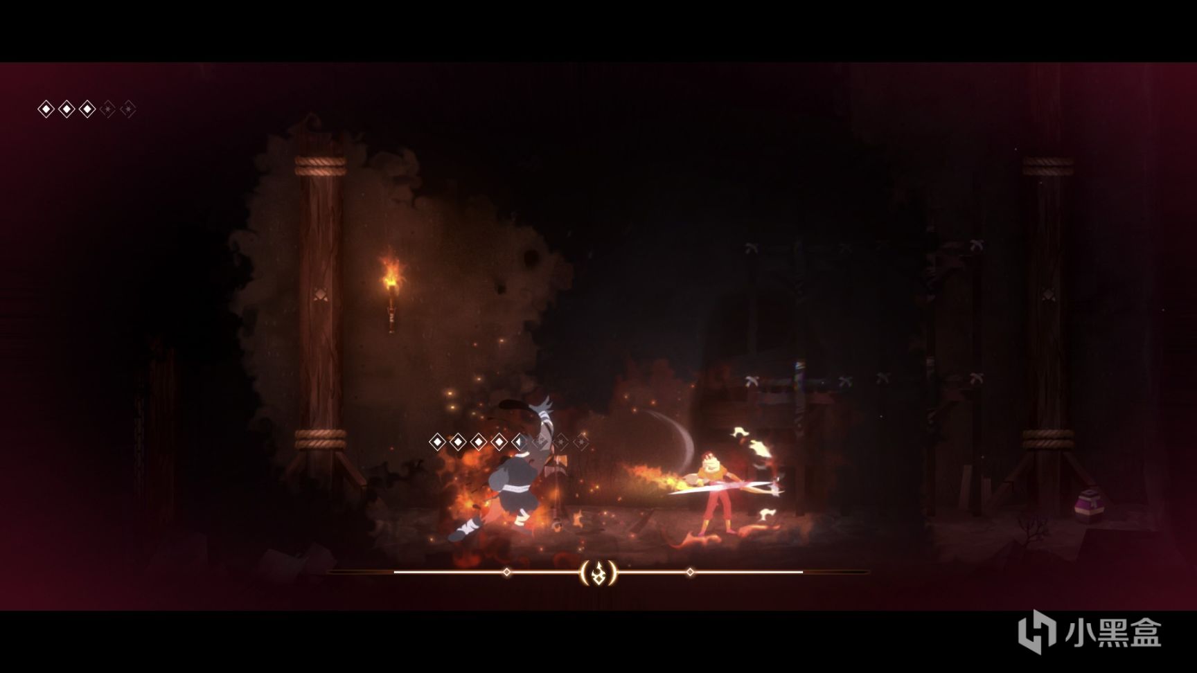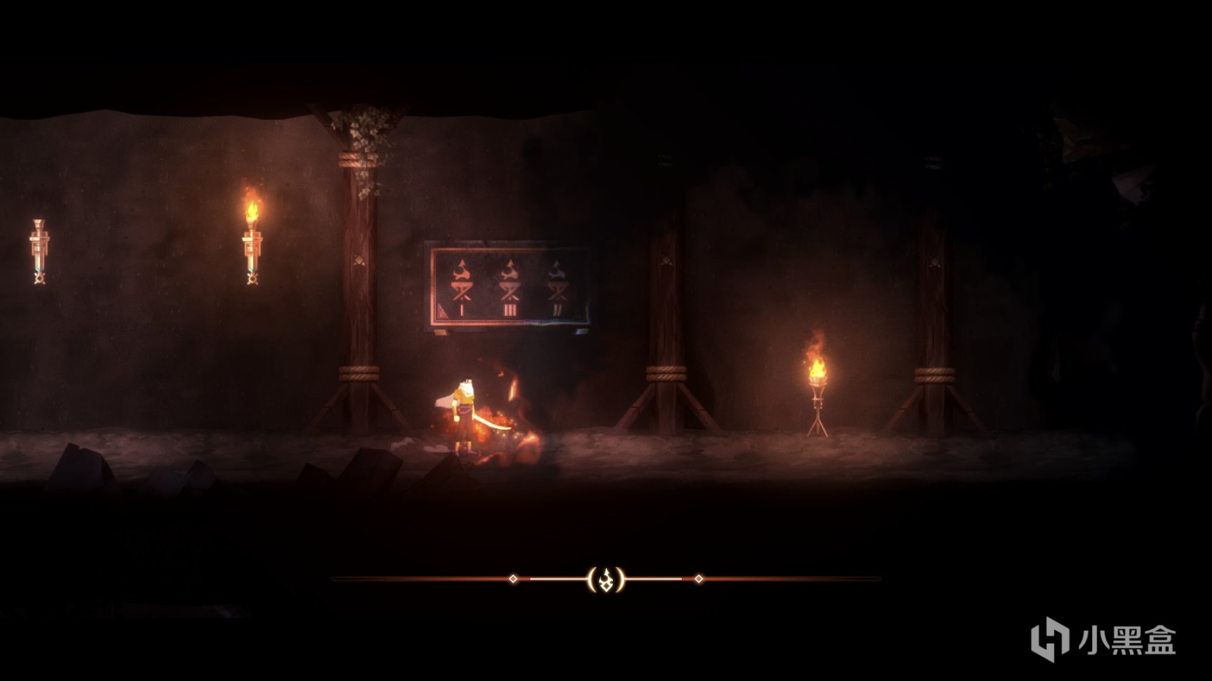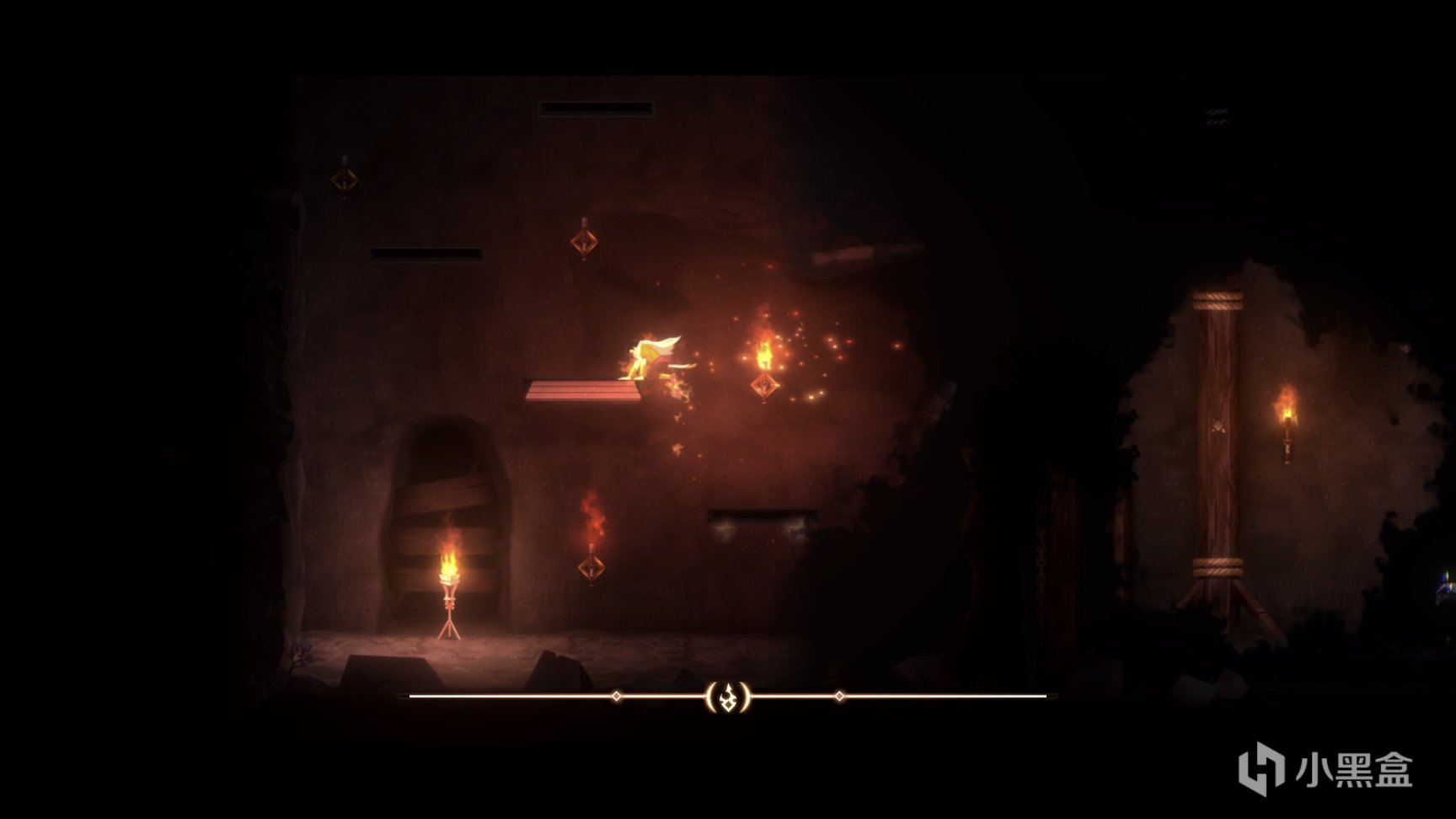 在战斗之外会有一些跳跳乐玩法,这自然也是横版动作游戏必不可少的一部分。本作没有二段跳的设定,取而代之的是跳跃中做出攻击动作可以跳得更远。之所以这样设计,也是和火有密切的关系——有些跳跳乐的机关需要我们使用带火的刀做出攻击动作来点亮,点亮之后的机关只有短暂的几秒钟可以让我们使用,我们就必须抓住这转瞬即逝的时机完成平台跳跃的动作,前往下一个地点。因此火这一要素的加入不仅改变了本作的战斗体验,也让跳跳乐玩法有了新的挑战。