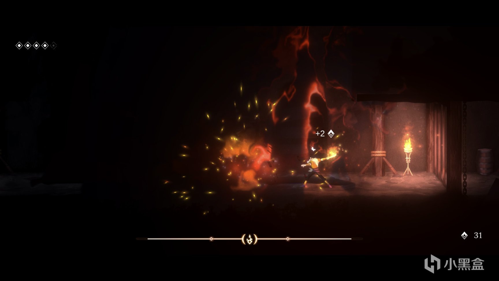 当我们用刀挥砍一个火源的时候,我们的刀就会被点燃,此时刀上火焰的熄灭计时条就会开始倒计时,我们需要在刀上的火焰熄灭之前找到下一个火把或者烛台,将其点燃之后刀上的火焰倒计时就会重置时间。这些可以点燃的火把或烛台大多数都位于墙壁上,点燃之后即为光源以及接下来传火的火源,有的还是解开一些机关或者暗门的开关——不过解谜的玩法要素不多,难度也不大,并不会对横版冒险的核心玩法产生喧宾夺主之感。