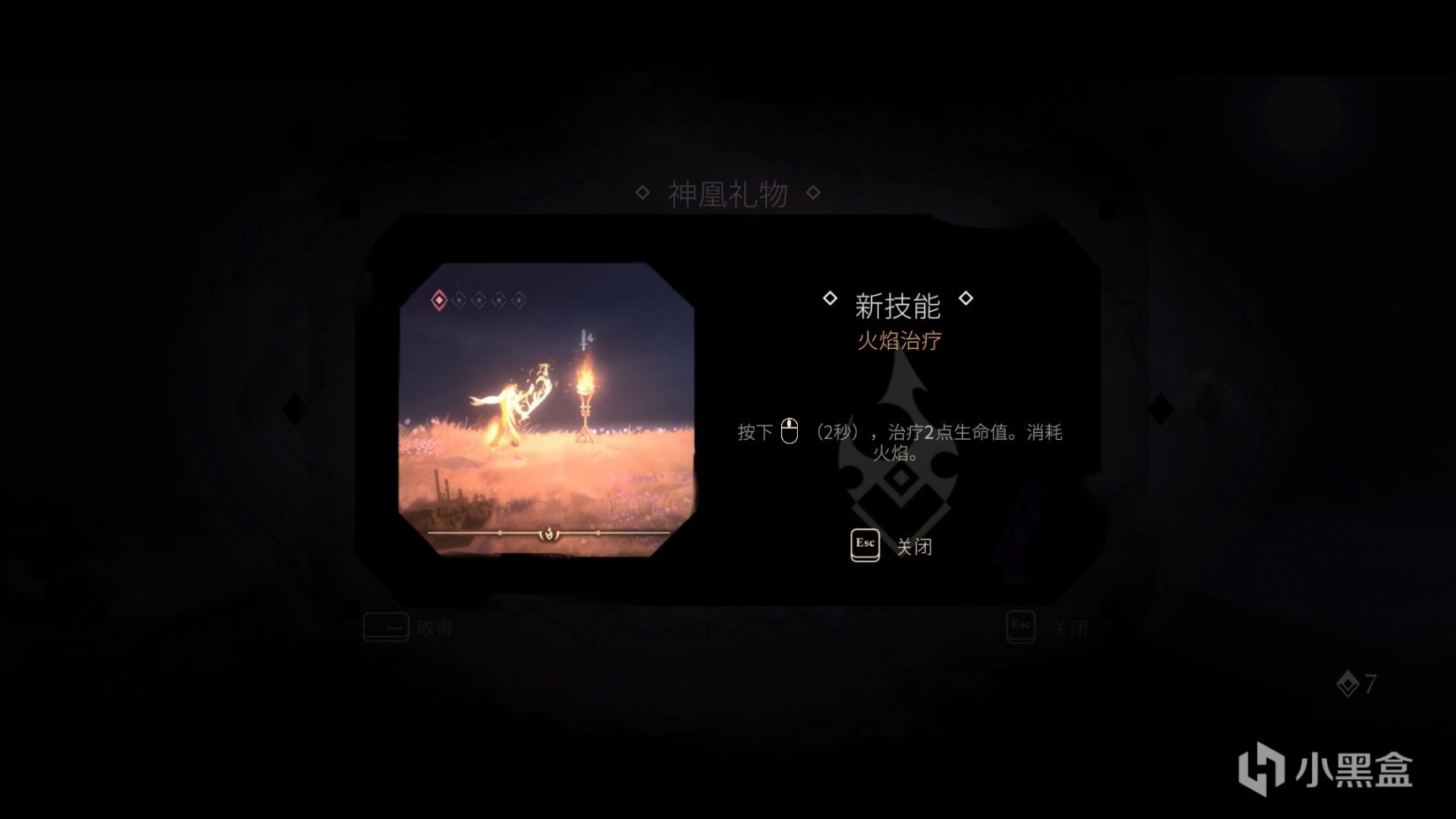 随着游戏的推进,我发现,火在本作中就意味着生命。其一体现在,当主角进入室内场景时,如果在战斗中处于完全黑暗的环境里,就会变得极其脆弱,生命值很快就会归零。有点亮的火把或者手中的刀处于燃烧的状态,就不会有这样的困扰。其二则体现在技能上,当玩家第一次打开被称为“神凰礼物”的天赋系统时,会学会一招叫做“火焰治疗”的技能,可以消耗玩家目前持有的火焰(也就是刀上点燃的火焰),给予主角两颗红心的生命值恢复,这就是主角脱战之后回血的手段,非常重要,等于说只要我们能找到火源,就拥有了在战斗之后补满血的办法。